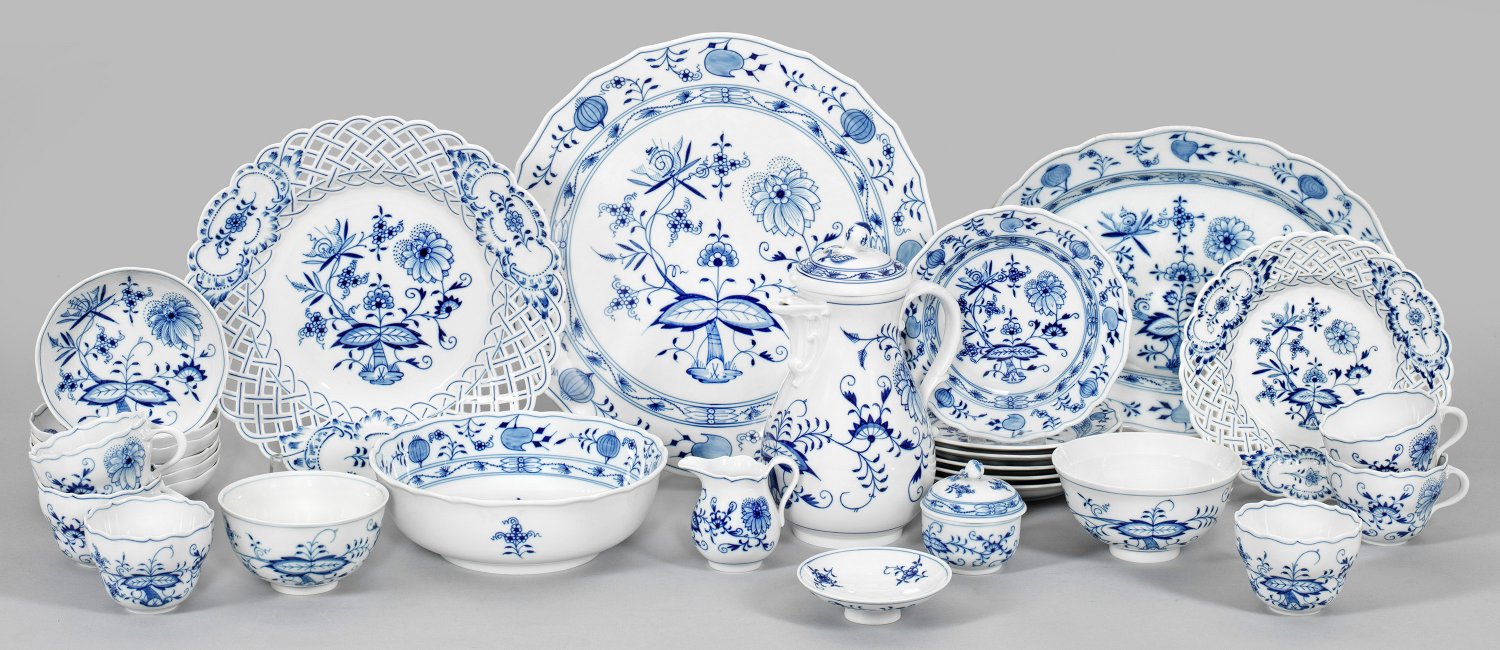 für 6 Personen. 22-tlg.; Kaffeekanne, Zuckerdose, Sahnegießer, 6 Kaffeetassen mit Untertassen, 6 Kuchenteller, Torten-, Kuchenplatte, Beilagen-, 2 Konfektschalen, 2 Gebäckteller. Zwiebelmusterdekor in unterglasurblauer Malerei. Teilw. durchbrochen gearbeitete Fahne. Beigabe: Deckel einer Reisschale. Teilw. minim. best. Schwertermarke. Kannen-H. 25 cm. Platten-L. 34,5 cm.