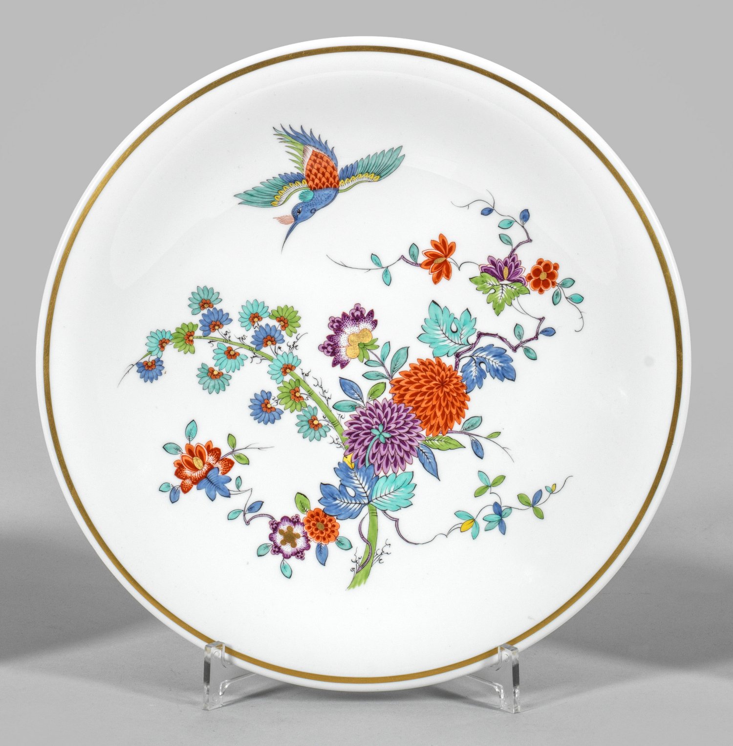 Runde, leicht vertiefte Form. Farbenprächtiger Indianischer Blumendekor aus Chrysanthemen- und Päonienzweigen sowie fliegendem Vogel im Kakiemonstil. Polychrome, goldgehöhte Malerei. Goldrand. Schwertermarke. D. 31 cm.