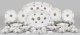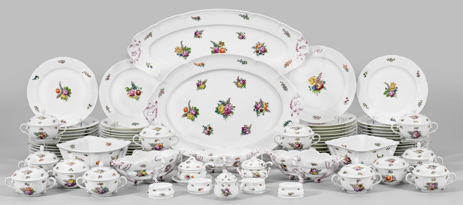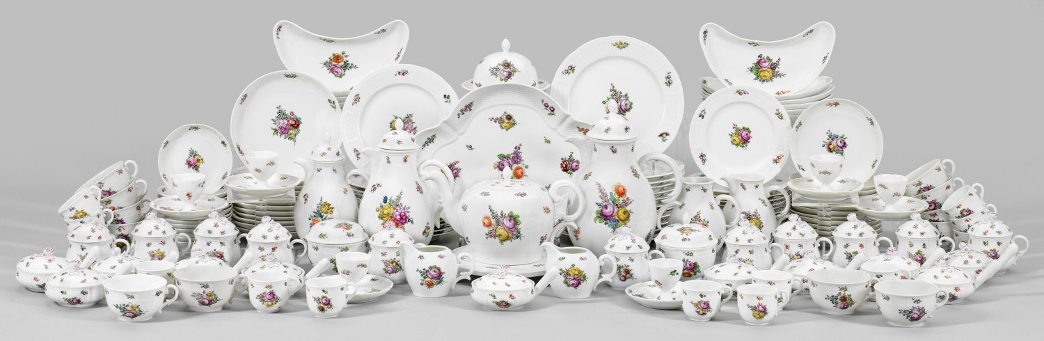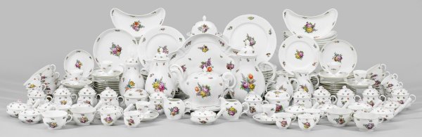172-tlg.; Mokka-, Tee-, 2 Kaffeekannen, 3 Zuckerdosen, 2 Sahnegießer, 2 Milchkännchen, 11 Mokka-, 12- Teetassen mit Untertassen, 21 Vorspeise-, 12 Speise-, 12 Suppen-, 12 Kuchen-, 12 Brot-, Anbietteller, 12 Suppentassen mit Untertassen, 12 Gräten-, 2 Beilagen-, 3 Anbietschalen, Braten-, Fisch-, Anbietplatte, 12 Cremetöpfchen, Senftopf mit Untertasse, 6 Eierbecher, 11 Butterpfännchen, 4 Salieren, Butterglocke, Kannenuntersetzer. Auf der Wandung, Fahne und im Spiegel gestreute Blümchen bzw. feine Blumenbuketts in polychromer Malerei. Ozierrelief. Teilw. purpurfarbene Staffierung. Beigabe: 2 Teetassen, Zuckerdosen- und Butterpfännchendeckel. Manufakturmarke. Kannen-H 18,5 cm - 26 cm. Platten-L. 34 cm - 61 cm.