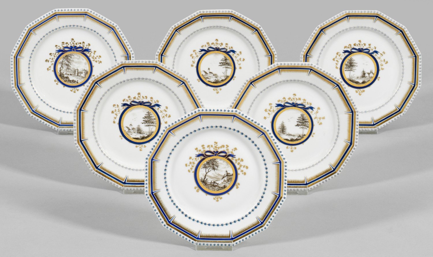 Zwölfeckige Form mit reliefiertem Perlfries. Im leicht vertieften Spiegel blau-gold gerahmtes Schleifenmedaillon mit Landschaftsveduten in Grisaillemalerei. Manufakturmarke. D. 16 cm.