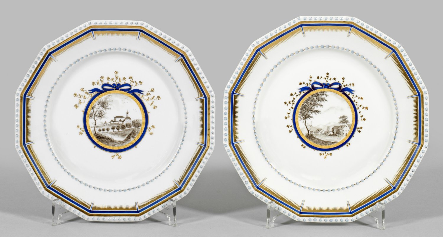 Zwölfeckige Form mit reliefiertem Perlfries. Im leicht vertieften Spiegel blau-gold gerahmtes Schleifenmedaillon mit Landschaftsveduten, u. a. Ansicht von Dachau, in Grisaillemalerei. Manufakturmarke. D. 24,5 cm.