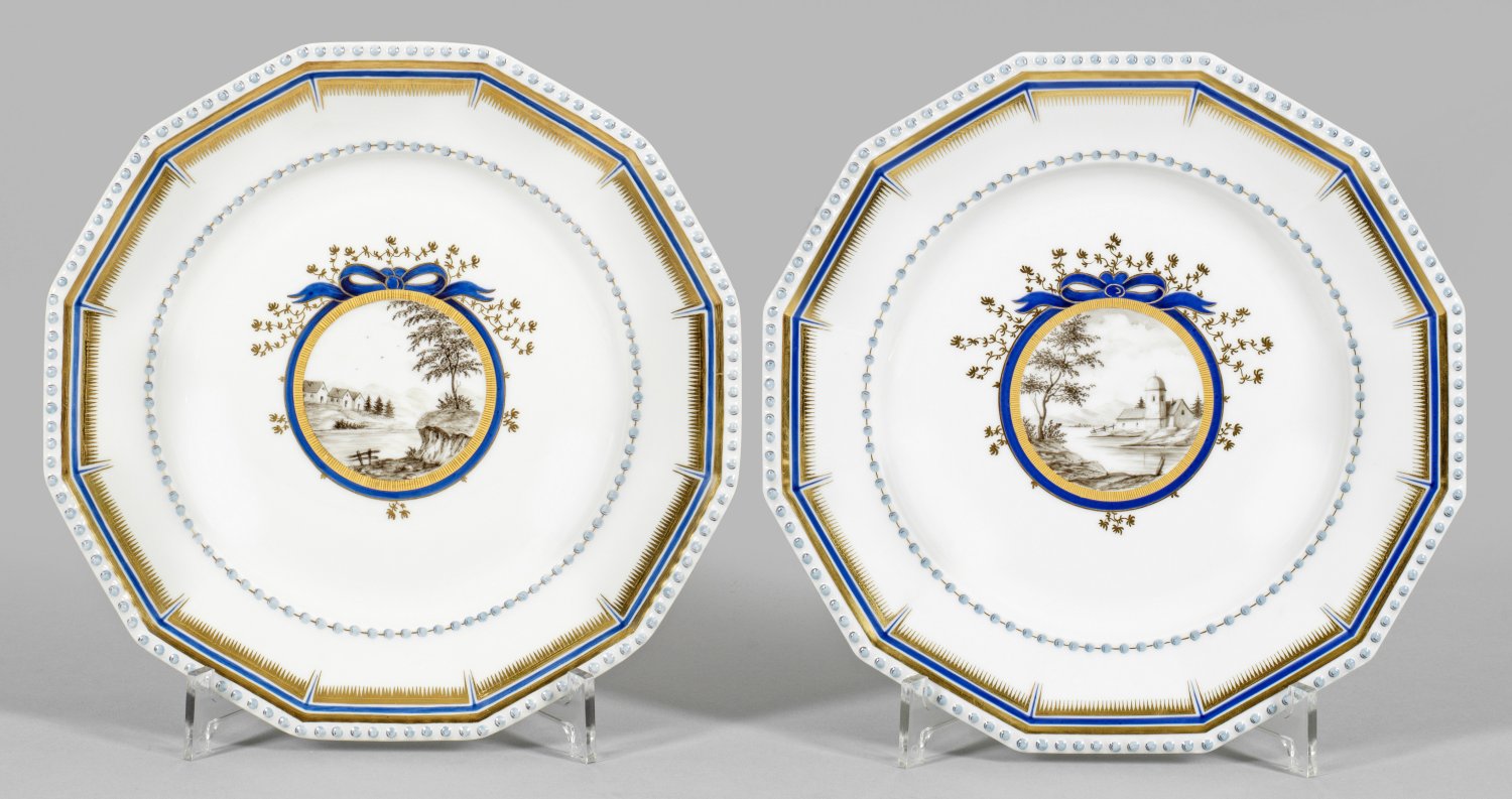 Zwölfeckige Form mit reliefiertem Perlfries. Im leicht vertieften Spiegel blau-gold gerahmtes Schleifenmedaillon mit Landschaftsveduten in Grisaillemalerei. Manufakturmarke. D. 24,5 cm.