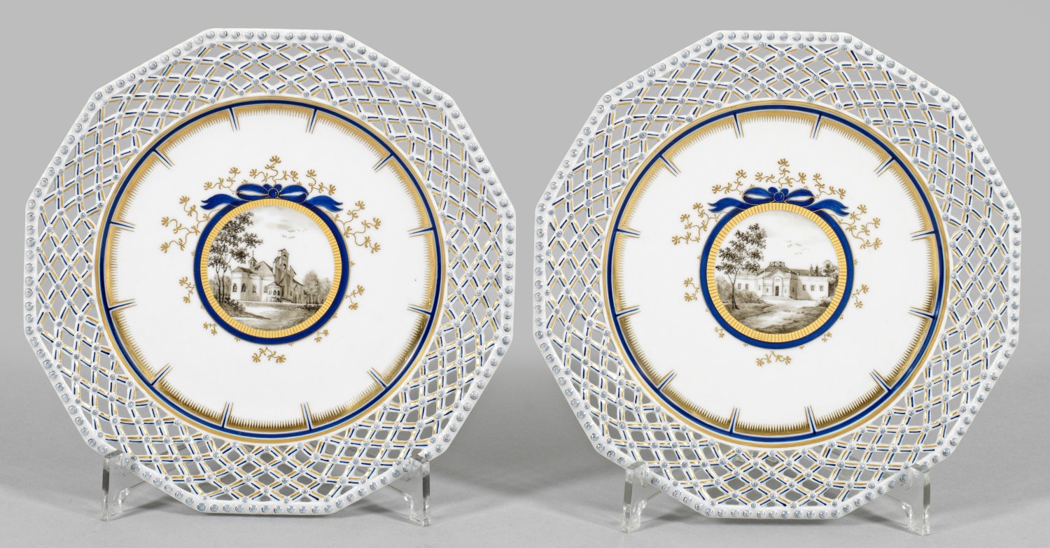 Zwölfeckige Form mit reliefiertem Perlfries und gitterförmig durchbrochen gearbeiteter Fahne. Im leicht vertieften Spiegel blau-gold gerahmtes Schleifenmedaillon mit Ansichten der Magdalenenkapelle bzw. Amalienburg in Grisaillemalerei. Manufakturmarke. D. 23 cm.