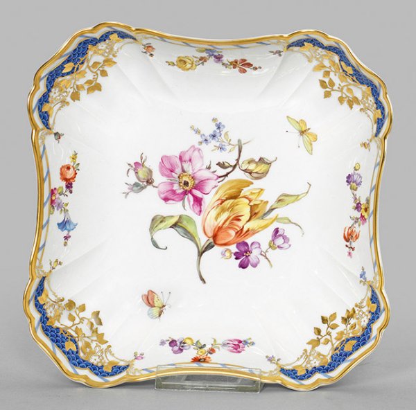 Quadratische, mittig eingezogene Form. Reliefdekor "Rocaille". Im vertieften Spiegel farbenprächtiges Blumenbukett, umgeben von Schmetterlingen, auf Innenwandung Blumenfestons und feine, von reliefiertem Rankenwerk umzogene, blaue Schuppenmosaikfonds. Polychrome Malerei mit reicher Goldstaffage. Zepter- und Malereimarke. 21 cm x 21 cm.