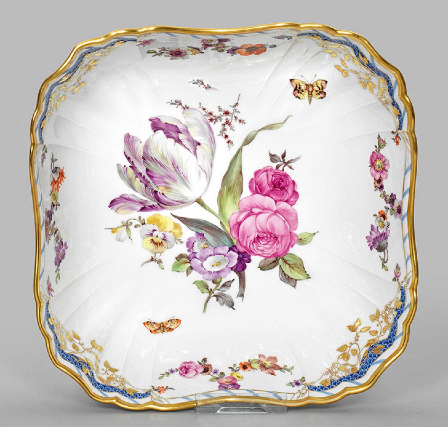 Quadratische, tief gemuldete Form. Reliefdekor "Rocaille". Im Spiegel farbenprächtiges Blumenbukett, umgeben von Schmetterlingen, auf Innen- und Außenwandung Blumenfestone und feine, von reliefiertem Rankenwerk umzogene, blaue Schuppenmosaikfonds. Polychrome Malerei mit reicher Goldstaffage. Zepter- und Malereimarke. 23 cm x 23 cm.