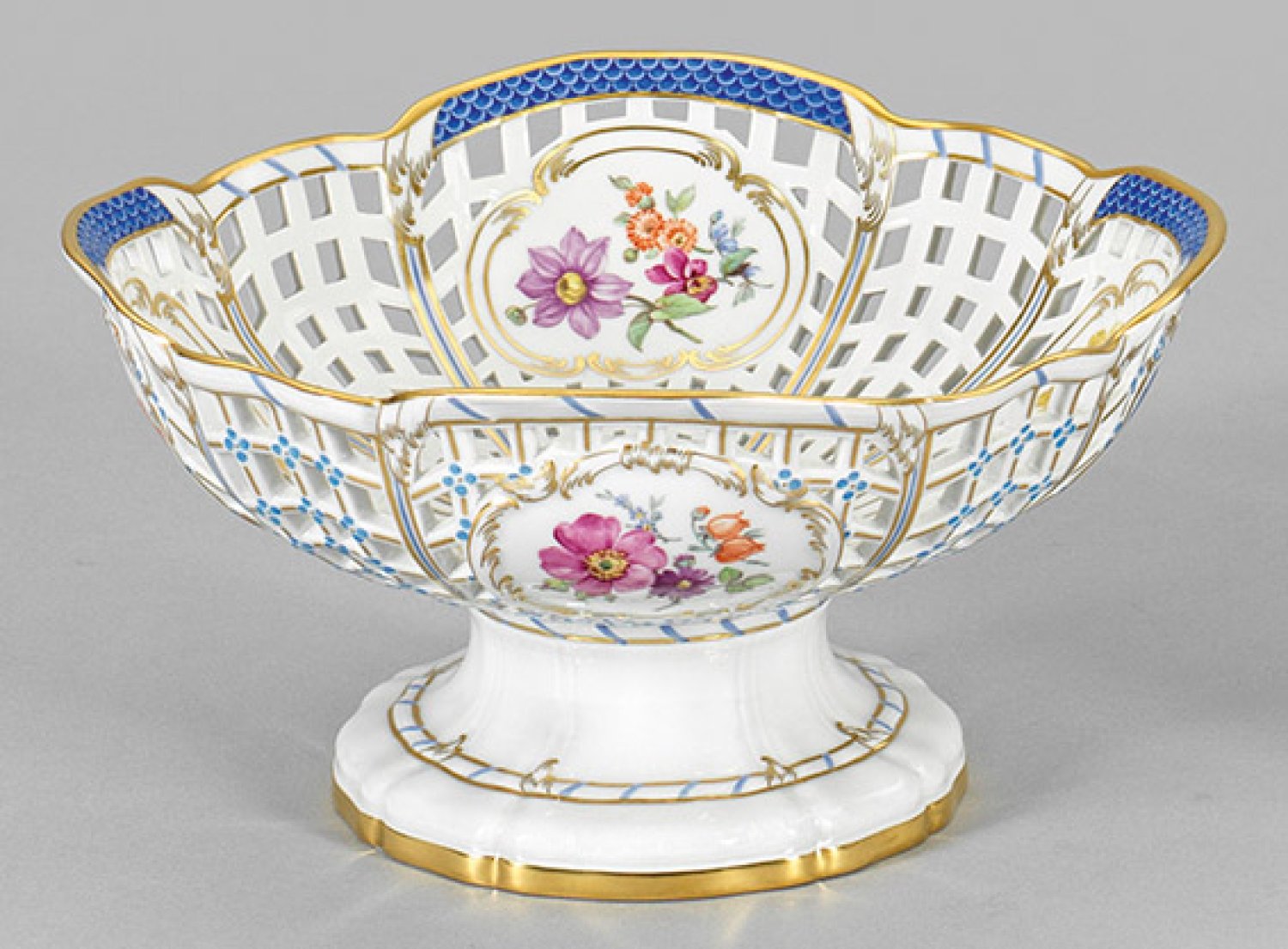 Annähernd quadratische Form auf eingezogenem Rundfuß mit gitterartig durchbrochen gearbeiteter Wandung, in den Schnittstellen reliefiert mit kleinen Vergissmeinnichtblüten. In großen Rocaillekartuschen farbenprächtige Blumenbuketts sowie feine, von Rankenwerk umzogene, blaue Schuppenmosaikfonds an der Randzone. Polychrome Malerei mit reicher Goldstaffage. Zepter- und Malereimarke. H. 10,5 cm. 19 cm x 19 cm.