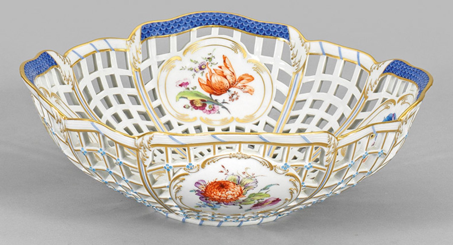 Annähernd quadratische Form mit gitterartig durchbrochen gearbeiteter Wandung, in den Schnittstellen reliefiert mit kleinen Vergissmeinnichtblüten. In großen Rocaillekartuschen farbenprächtige Blumenbuketts sowie feine, von Rankenwerk umzogene, blaue Schuppenmosaikfonds an der Randzone. Polychrome Malerei mit reicher Goldstaffage. Zepter- und Malereimarke. H. 9,5 cm. 27 cm x 27 cm.