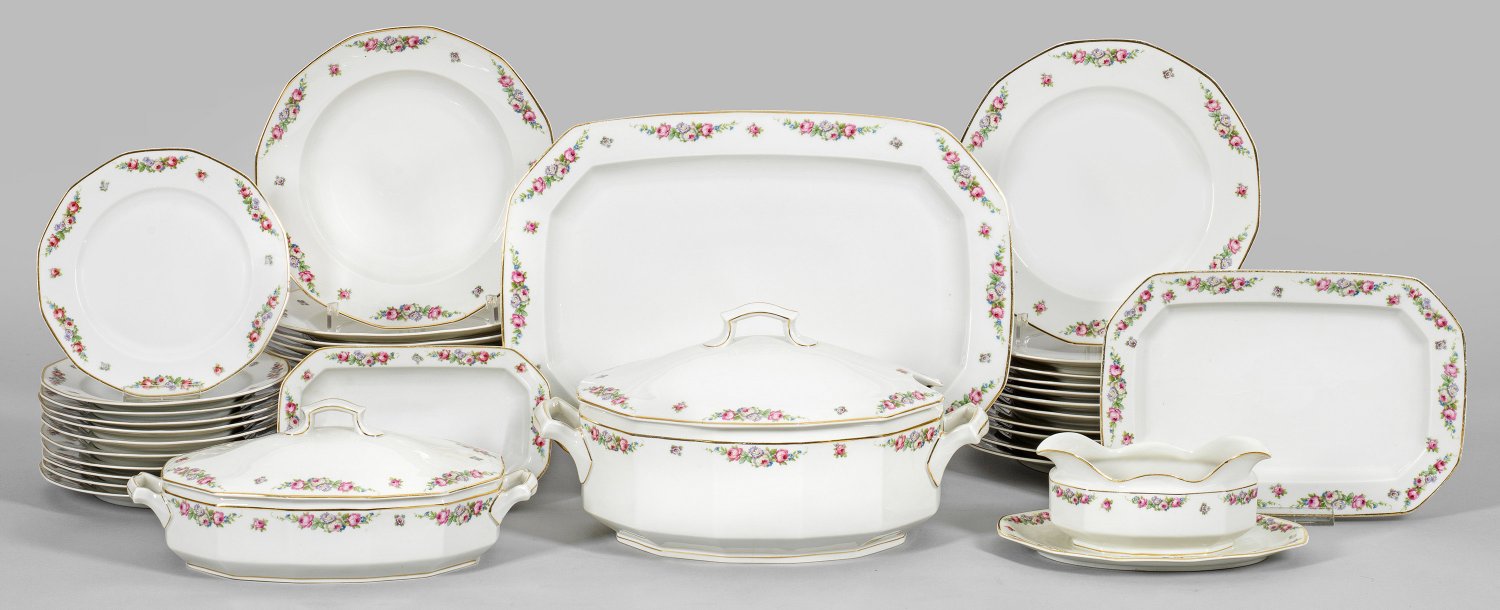 für 11 Personen. 39-tlg.; Braten-, 2 Anbietplatten, 2 Terrinen, Sauciere, 11 Vorspeise-, 11 Speise-, 11 Suppenteller. Auf der Wandung und Fahne zarte Rosengirlanden in farbigem Umdruck. Goldrand. Ber./teilw. Haarriss.; Manufakturmarke. Platten-L. 21 cm - 40 cm.