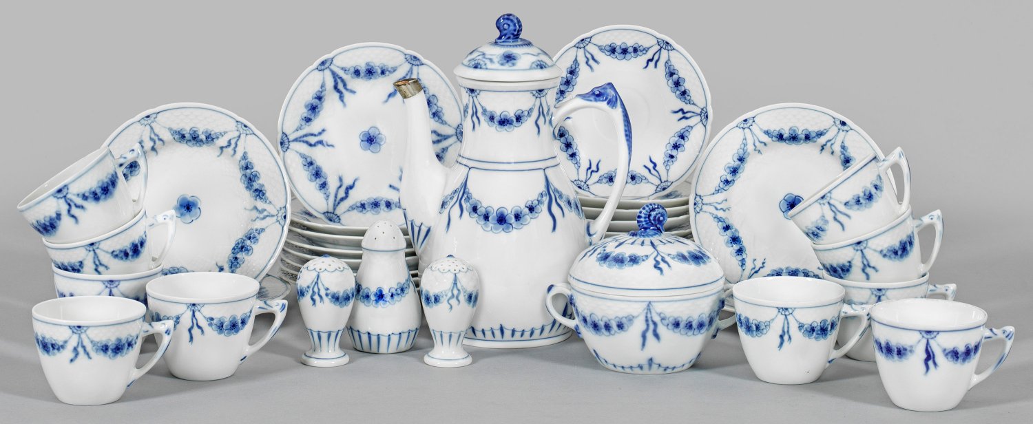 26-tlg.; Kaffeekanne, 10 Kaffeetassen mit Untertassen, 2 Salzstreuer, Pfefferstreuer und 12 Konfektteller. Schuppenrelief mit unterglasurblauem "Empire"-Dekor. Kannenausguss mit Manschette.; Manufakturmarke. Kannen-H. 24 cm. Teller-D. 14, 5 cm - 15,5 cm.