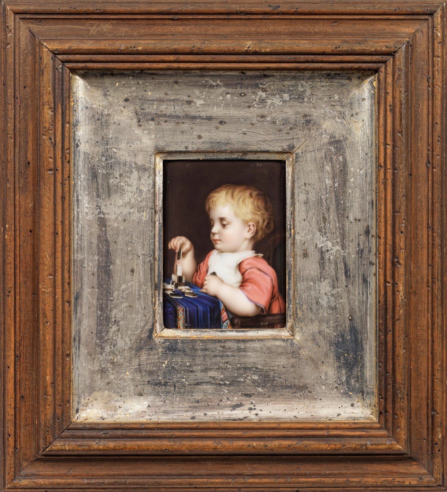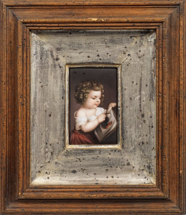 Rechteckige Bildplatte mit Bildnis eines Mädchens beim Betrachten eines Bilderbuches bzw. Knabe beim Spielen mit Domino-Steinen. Äußerst feine, polychrome Malerei. Profilierter Holzrahmen. Platte 12 cm x 8 cm. Rahmen 32 cm x 28 cm.