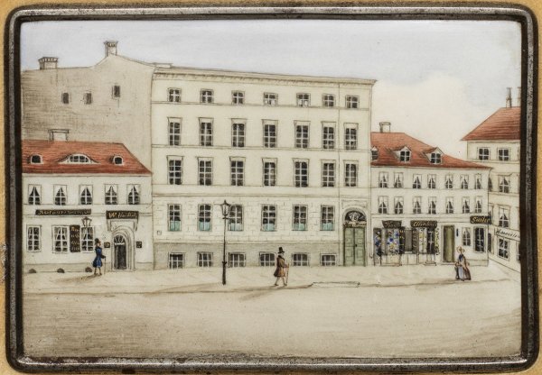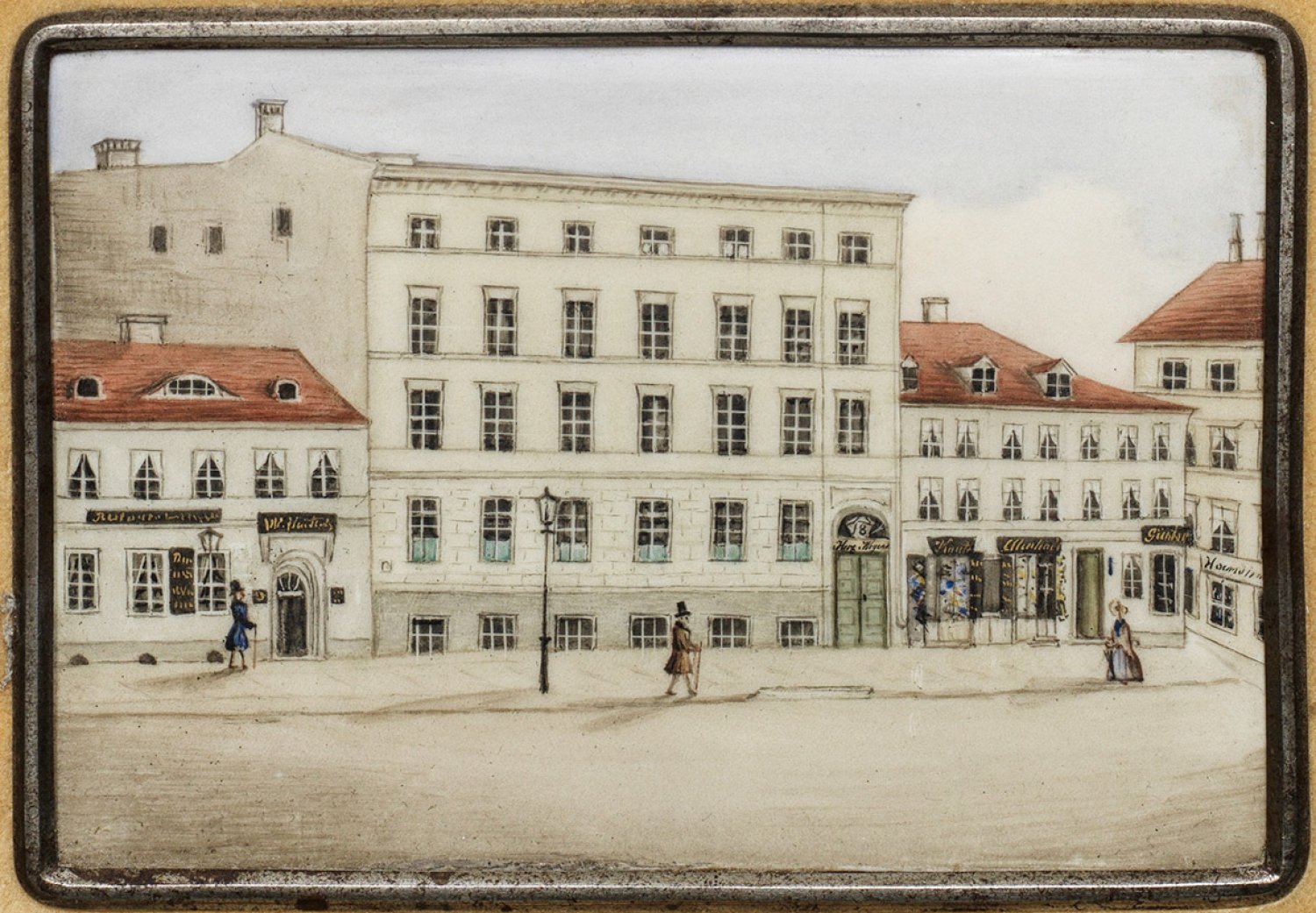 Rechteckige Bildplatte. Städtische Ansicht der Mohrenstraße in Berlin mit Blick auf die Stickmusterverlagshandlung "Hertz & Wegener", Haus-Nr. 18 sowie Figurenstaffage. Polychrome Malerei. Rücks. bez. Profilierter, stuckierter, vergoldeter Rahmen mit Metallleiste und gelbbeiger Samtblende. Platte 9,5 cm x 13,5 cm. Rahmen 25,5 cm x 29,5 cm.