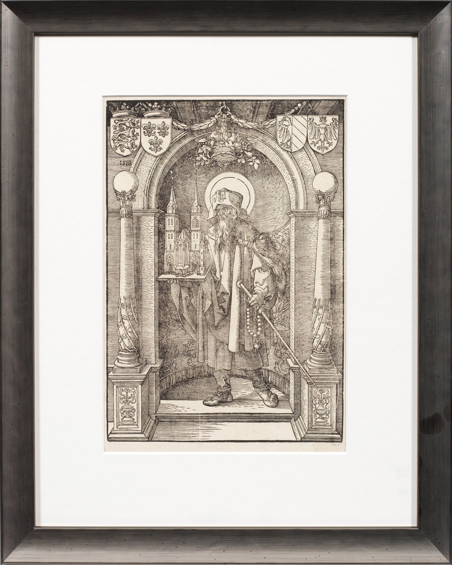 Holzschnitt/Papier, 1518. L. o. im Stock dat.; Wasserzeichen mit dem Wappen von Nürnberg (Meder 209). Wvz. Meder, S. 196, b (mit dem Sprung, Zustand a); Schoch/Mende/Scherbaum 251. Prachtvoller, tiefer, äußerst harmonischer Abzug mit schönen Randeinfassungslinien. Dargestellt ist der Heilige in Pilgertracht mit Stab und Rosenkranz, in der rechten Hand ein Modell seiner Kirche in Nürnberg haltend; die architektonische Rundbogen-Nische im neuen Stil der Renaissance, oberhalb von der Decke hängend ein Feston mit vier Wappen. Das ehemals Hans Springinklee zugeschriebene Blatt, das Meder noch der "Dürer-Schule" zuwies, wird in der jüngeren Forschung dem Nürnberger Meister selbst zugeschrieben. Der Hl. Sebald und die Nürnberger Sebalduskirche waren von großer Bedeutung für den religiösen Dürer: er lebte im Viertel um die Kirche, in der er getauft und vermählt wurde, zudem ruhten auch seine Eltern und früh verstorbenen Geschwister auf deren Friedhof. Darstellung ca. 30,1 cm x 21,2 cm. Rahmen.
