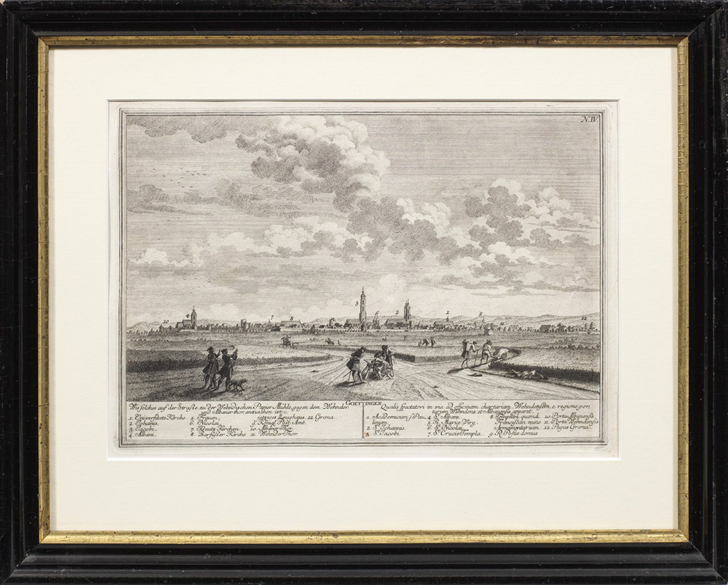 Kupferstich, erschienen 1747 als Blatt IV aus "Wahre der Königl. Groß-Britan. und Churfürstl. Braunschw. Lüneb. Stadt Göttingen (...)", Hrsg. G. D. Heumann, Göttingen, 1747. Plattenmaß ca. 23 cm x 33,5 cm. Rahmen.