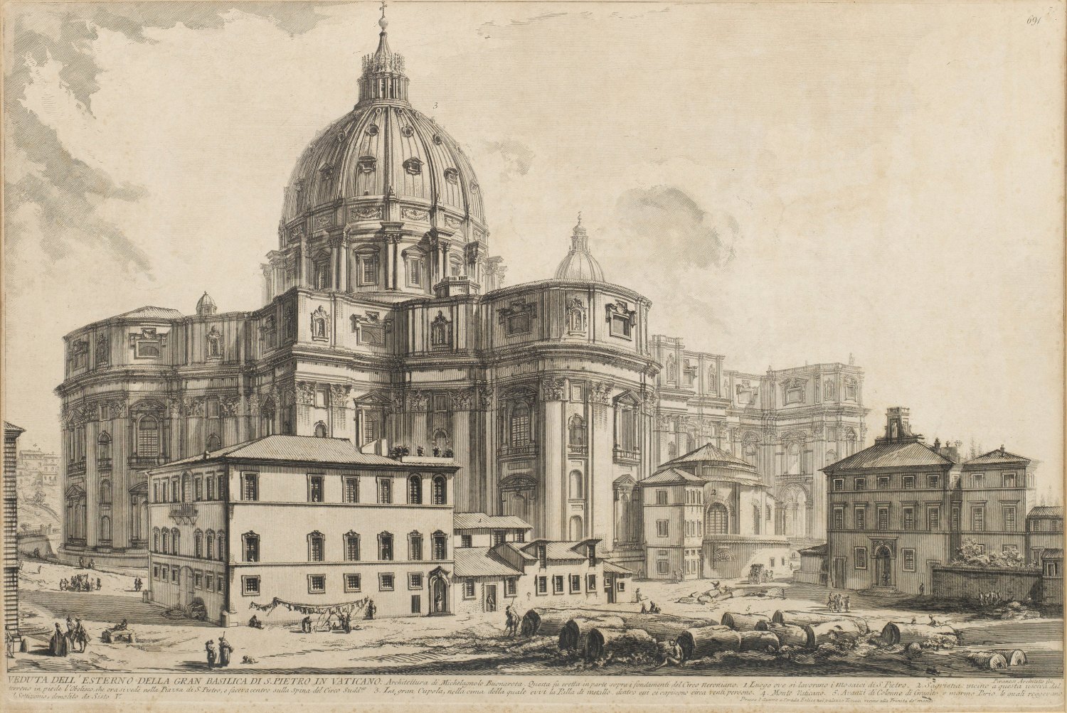 Kupferstich/Papier, um 1760. In der Platte bez. Südliche Außenansicht des Petersdoms mit Personenstaffage und Baumaterial im Vordergrund, aus dem 1751 erstmals erschienenen Radierzyklus "Veduta die Roma". Ger. gebräunt, stockfleckig. Plattenmaße 39,5 cm x 60,5 cm. Rahmen.