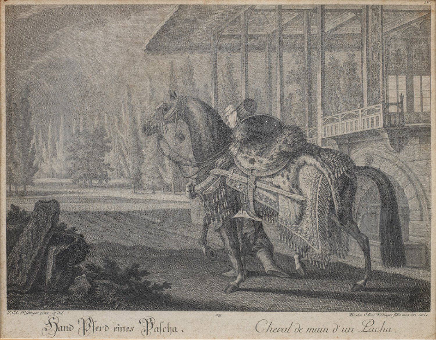 Kupferstich/Papier, 1752. In der Platte sign. u. betitelt. Blatt IV der Folge "Hippologischer Glanz des Morgenlandes". Wvz. Thienemann/Schwarz 597. 27,5 cm x 34,5 cm (Passepartoutausschnitt). Rahmen.
