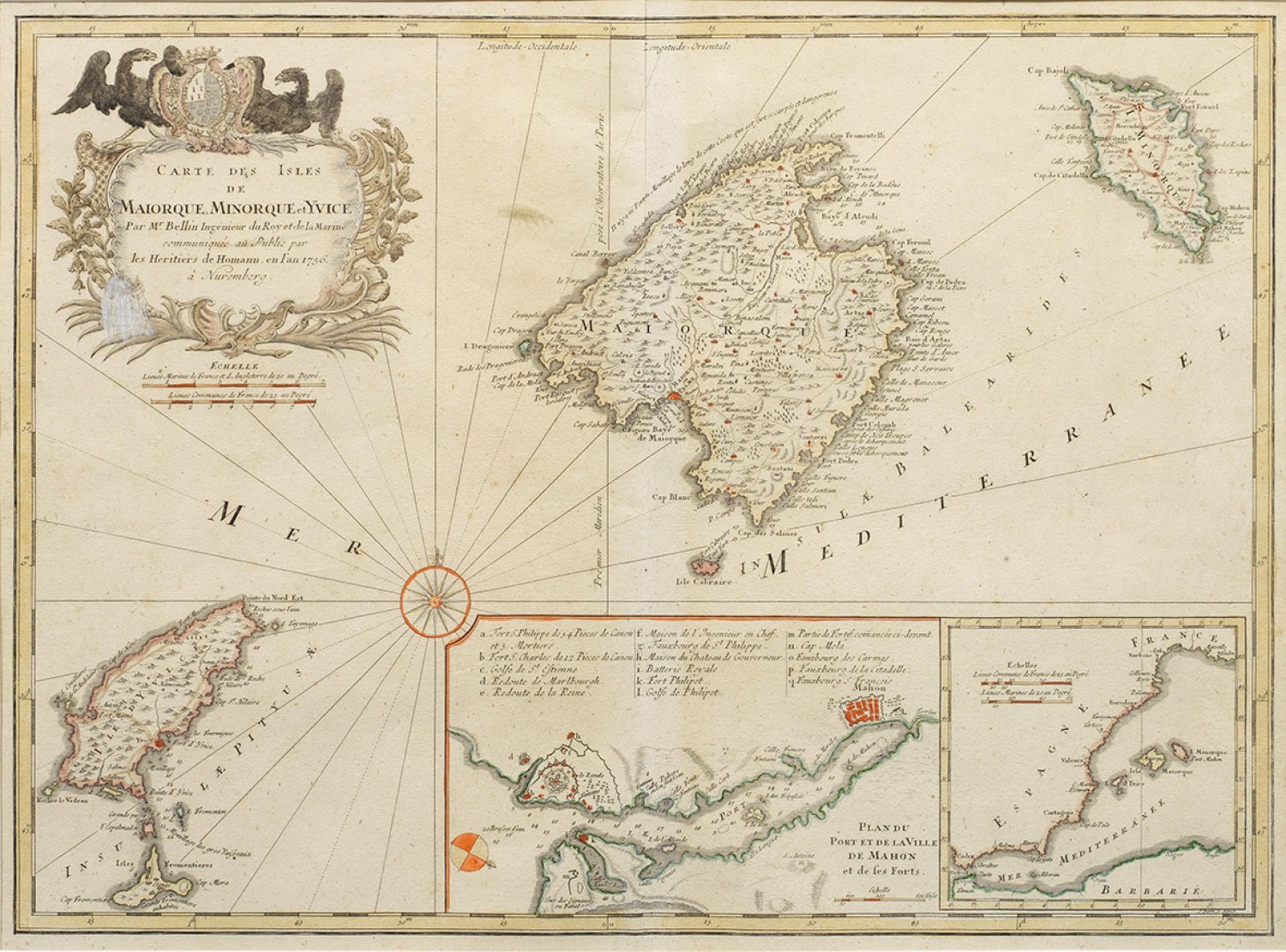 Altkolorierter Kupferstich, erschienen bei Homann Erben, Nürnberg, in der Platte dat. 1756. Überaus detailreiche Karte der Balearischen Inseln mit Mallorca, Ibiza, Menorca, Formentera und Cabrera. Die eine Insetkarte zeigt die Stadt von Mahón (Maó) mit der Festung, die andere die Lage der Balearen im Mittelmeer. Ca. 42 cm x 47,5 cm (Passepartoutausschnitt). Rahmen.