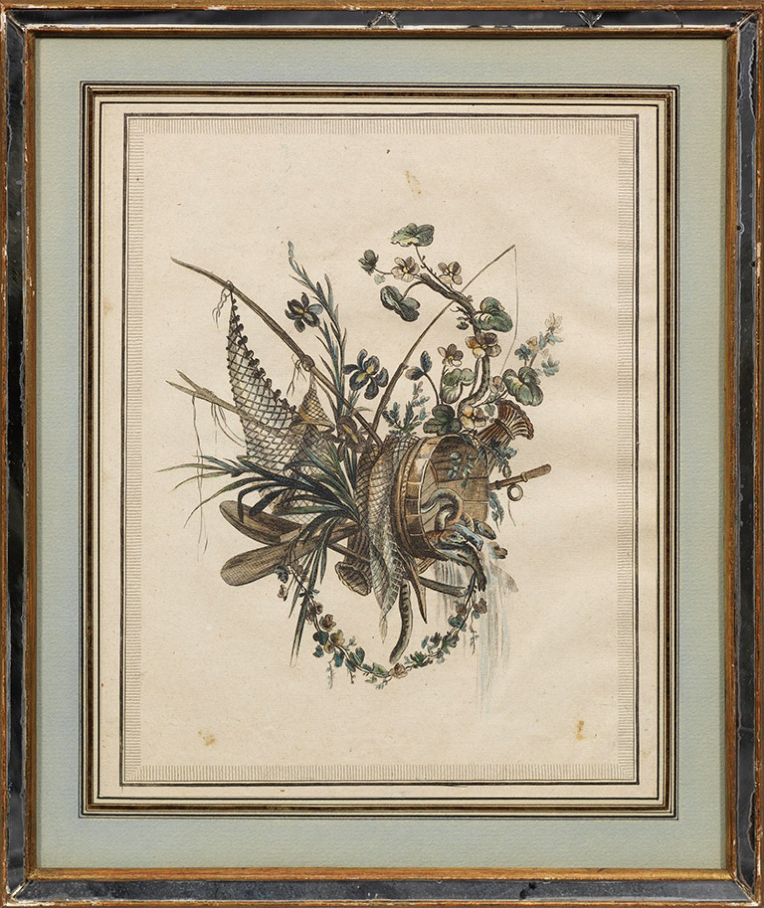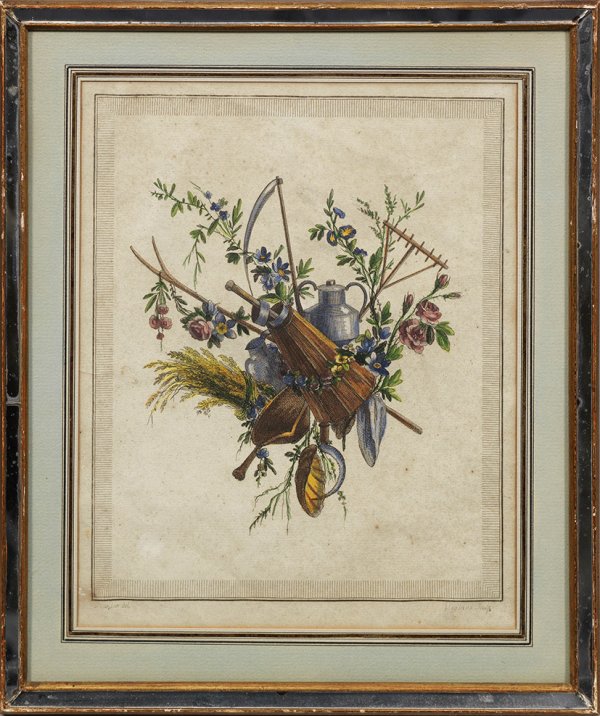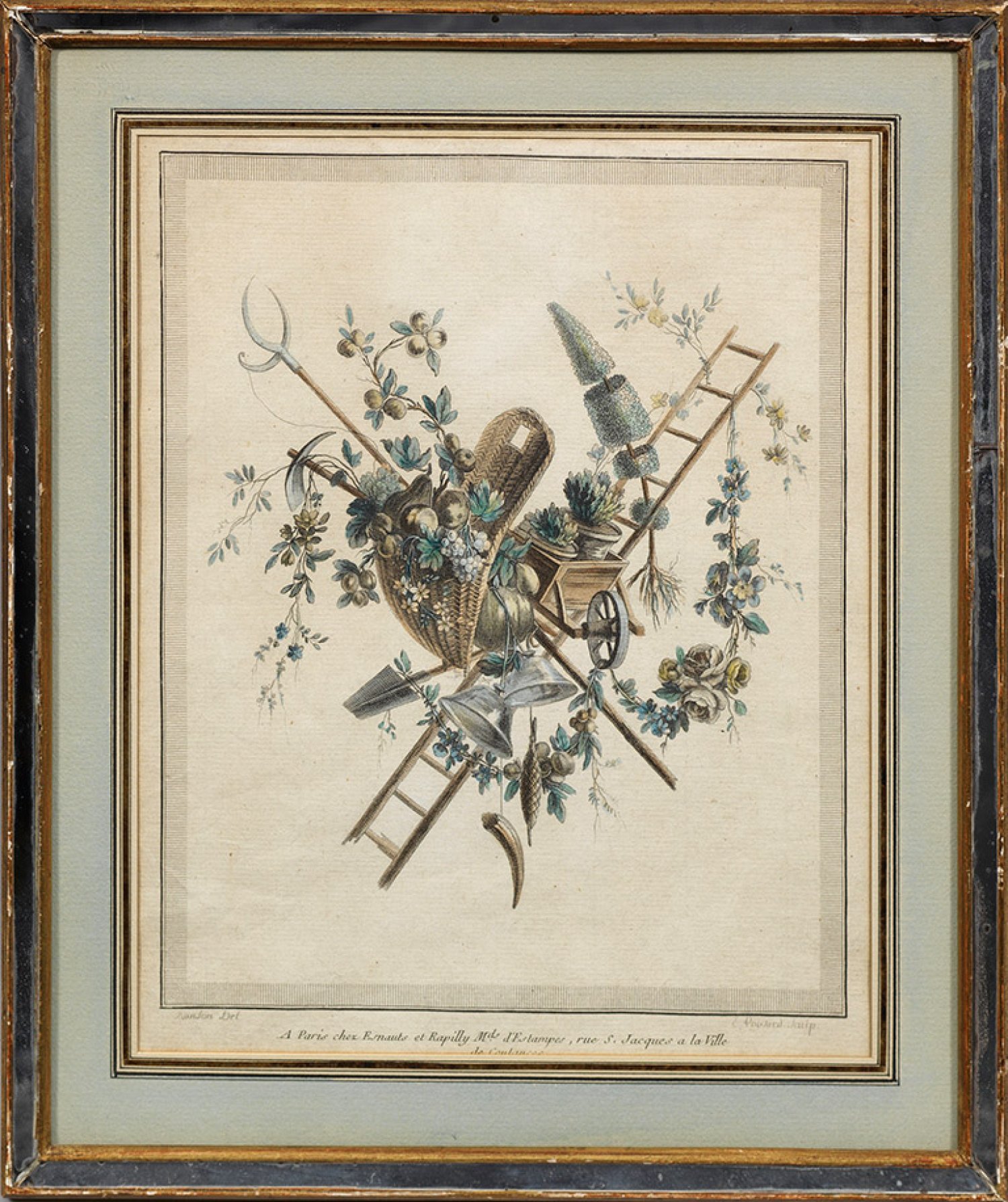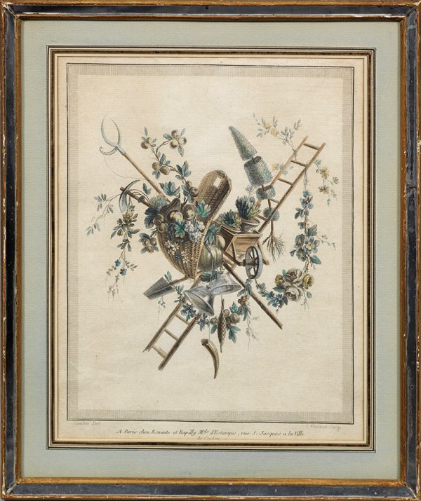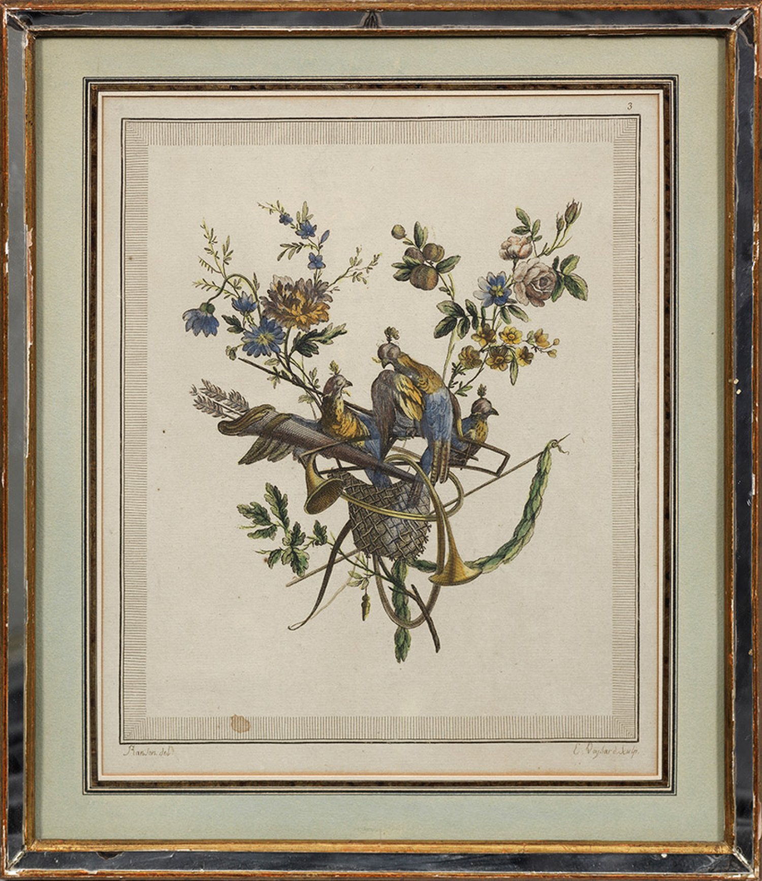 Altkolorierte Radierungen bzw. Kupferstiche. Nach Pierre Ranson (1736 - 1786). Aus: "Oeuvres contenant un recueil des trophées, attributs cartouches, vases, fleurs, ornemen(t)s (...) composés et dessinés par Ranson", erschienen im Verlag von Esnauts et Rapilly, Paris 1778. Ca. 27 cm x 21,5 cm (Passepartoutausschnitt). Rahmen.