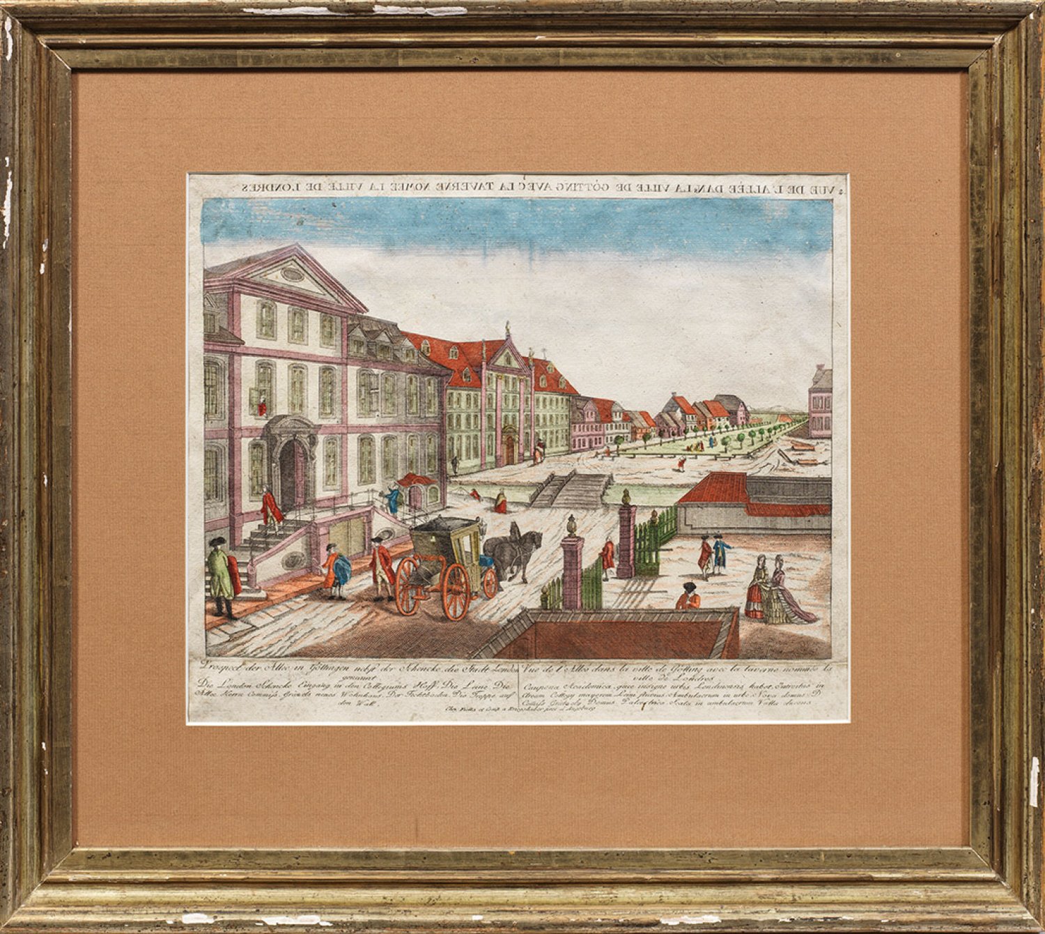 Altkolorierter Kupferstich "Prospect der Allee in Göttingen (/) Nebst der Schenke (...)" von Balthasar Friedrich Leizelt gestochen, erschienen in der Kaiserlich Franziskischen Akademie, Augsburg, um 1786-1790. Unterhalb deutsch-französisch betitelt. Dargestellt ist die Goethe-Allee mit dem 1739 erbauten Grätzelhaus und der englischen Gaststätte mit reicher figürlicher Staffage und einer Pferdekutsche. Plattenmaß ca. 31 cm x 37 cm (Passepartoutausschnitt). Rahmen.