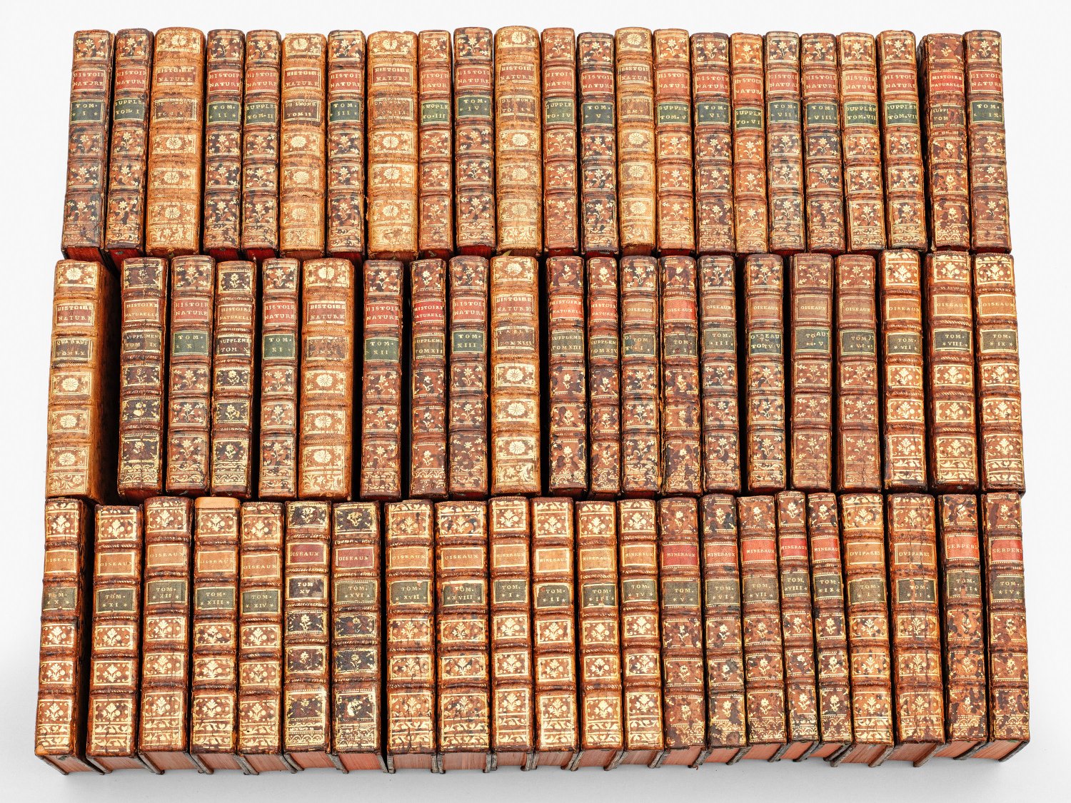 Umfangreiche Sammlung von 66 Bänden; Bd. 1-13 "Histoire Naturelle, Générale et Particulière"; Bd. 1-14 "Histoire Naturelle, Suppléments"; Bd. 1-18 "Histoire des Oiseaux"; Bd. 1-4 "Histoire des Quadrupèdes Ovipares et des Serpens"; Bd. 1-9 "Histoire des minéraux" sowie 5 Bd. "Histoire de L'Homme" sowie drei weitere Bände "Histoire Naturelle, Quadrup". Detailreiche Kupfertafeln und -karten. U.a. gest. Exlibris der Säfstaholms Bibliothek von J. F. W. Mester sowie handschriftliche Notizen. Gemaserte Kalbsledereinbände, Rückenschild mit Vergoldung. Teilw. stockfleckig, Einbände minim. besch.; Nicht kollationiert. 17 cm x 10,5 cm.