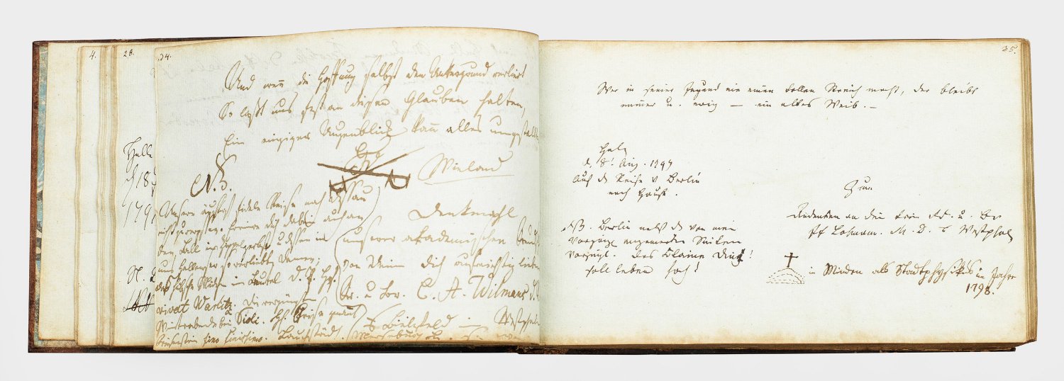 Stammbuch mit Inschrift des Albumhalters: "T. A. Deteleff. Friso Guestphalus, hunc librum memoriae amicorum dedicavit. Halae d. 15 Junii 1797". Mit 154 persönlichen Widmungen, Gedichten und Phrasen. Verschiedene Einträger, u. a. Achenbach, W. F., von Breitenbauch, A., von Emden, E. S., von Flemming, C., von Oertzen, L., Thorbecke, L. und von Ziemiecki, A. Teilw. mit Zirkel des Corps. Stammbucheinträge in Deutsch und Latein. Eintragsorte u. a. Halle, Jena und Schlesien. Brauner Ledereinband mit reicher Goldprägung. Goldschnittverzierung. Altersgemäße Gebrauchsspuren. Nicht kollationiert. 23,5 cm x 18,5 cm.