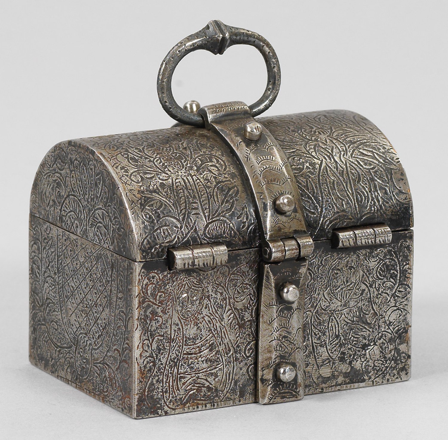 Eisen, geätzt. Rechteckig mit gerundetem Deckel. Allseitig flächendeckender figuraler und floraler Dekor. Breite Überfalle und Tragegriff. Innen rot lackiert. H. 6,5 cm. 8 cm x 7 cm.
