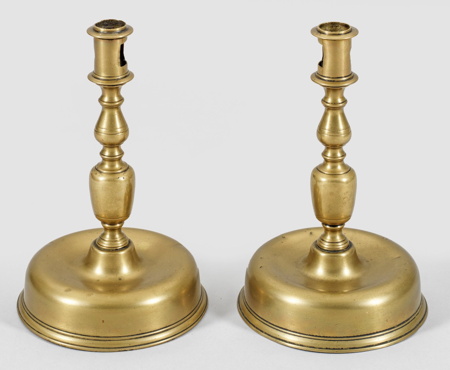 Messing. Glockenförmiger, gering gemuldeter Stand, übergehend in aufsteigenden Balusterschaft, gegliedert von Scheiben, Querrillen und Nodi. Zylindrische Tülle mit Reinigungsöffnungen. Minim. altersbedingte Gebrauchsspuren. H. 24,5 cm.