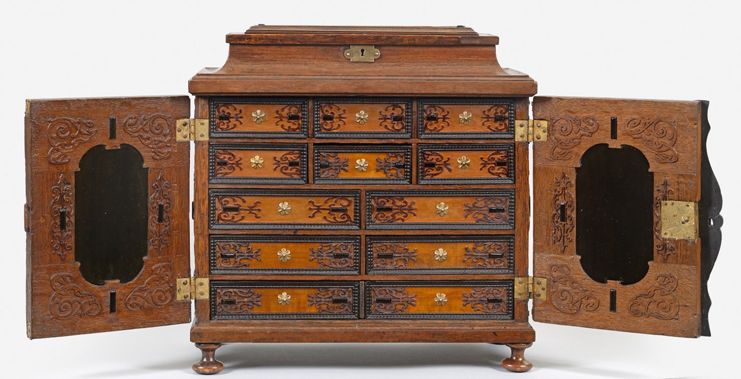 Nussbaum und Eichenholz, teilw. reliefplastisch geschnitzt bzw. ebonisiert. Gerader Korpus, allseitig mit großen, von reliefiertem Blattwerk umgebenen Reserven auf Balusterfüßen. In der Front zwei große Türen. Dahinter gestaffelte Facheinteilung aus diversen Schubfächern mit Flammleisten und Geheimfächern. Geschweift ansteigender oberer Abschluss mit verschlossener Lade. 37 cm. 37 cm x 17 cm.