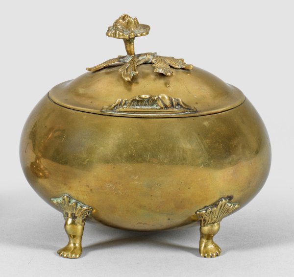 Messing. Auf vier Tatzenfüßen ovaler, glatter Korpus mit scharniertem Deckel. Knauf in Form einer vollplastischen Blüte. Scharnieransatz und Drücker rocailliert. Unterseitige Gravur "A.K.H.", Herstellermarke sowie dat. "1785". Innen verzinnt. H. 12,5 cm. B. 13 cm.