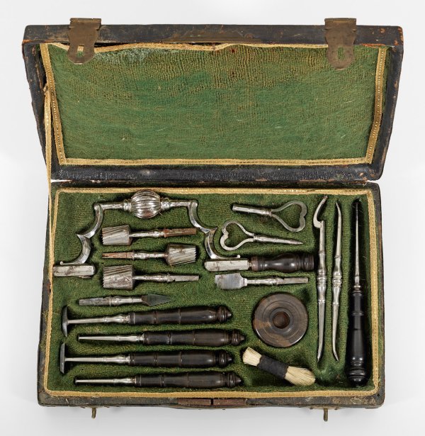 16-tlg.; Chirurgenbesteck im lederbezogenen Holzkasten mit Messingbeschlägen. Bestehend aus Trepanierer, verschiedenen Bohraufsätzen und Hebewerkzeugen aus poliertem Eisen mit Holz- bzw. Horngriffen sowie Pinsel. Innen Facheinteilung, bezogen mit grünem Stoff. Auf dem Deckel Besitzeretikett. H. 6 cm. 30,5 cm x 20 cm.