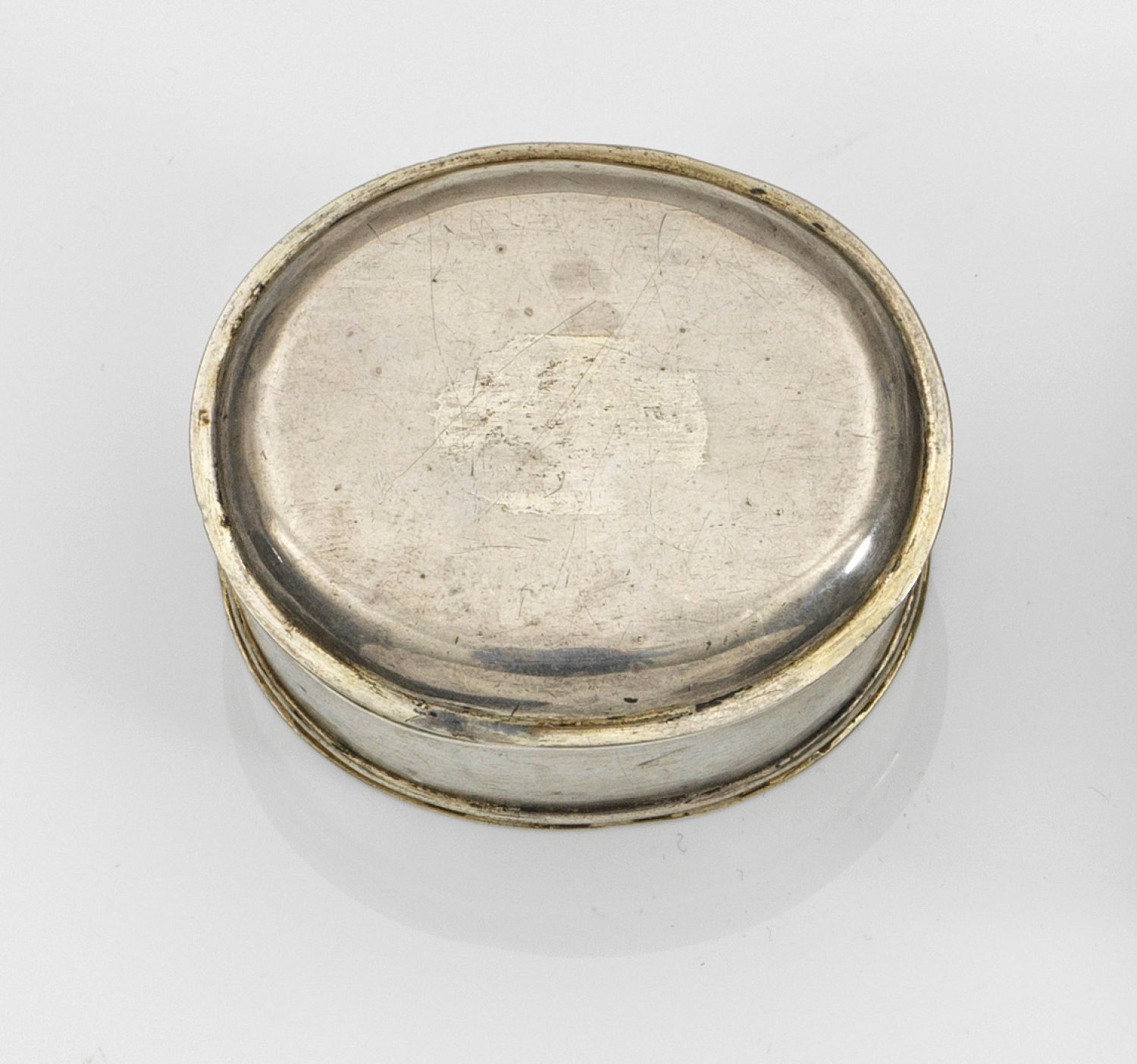 Silber. Ovaler Korpus über gering ausgestelltem, wulstartigem Stand. Gerin gewölbter, scharnierter Stulpdeckel mit ausgestelltem Rand. Mit Restvergoldung. Gew. ca. 45 g. H. 3,5 cm. 6 cm x 5 cm.