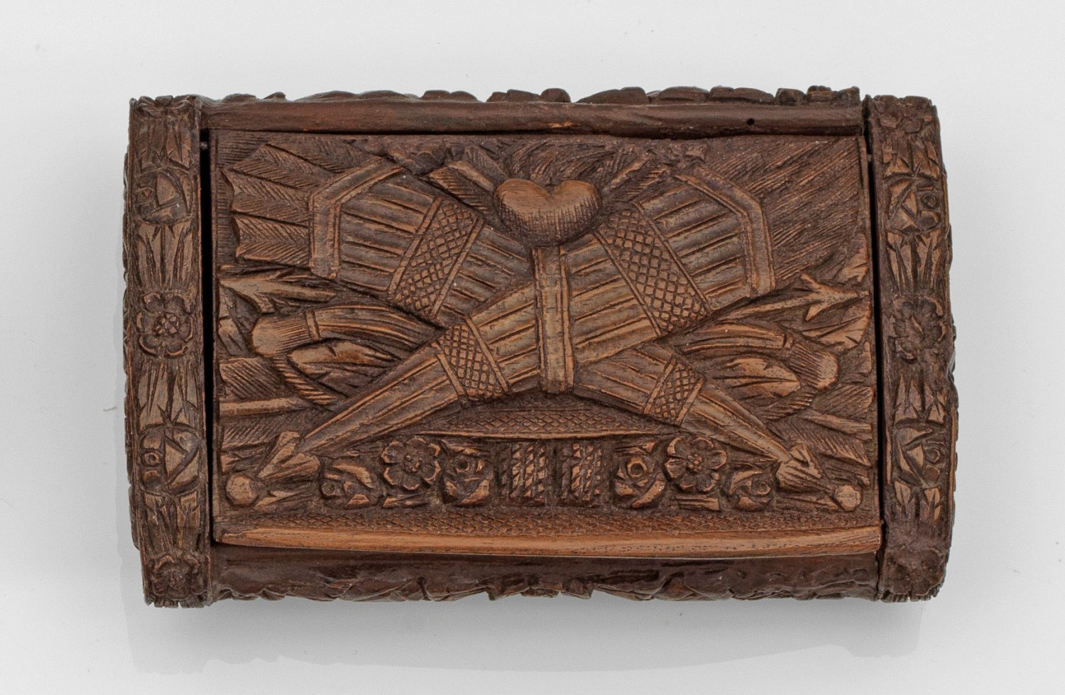 Coquilla-Nuss, geschnitzt. Rechteckige Form mit scharniertem Deckel. Flächendeckend reliefplastisch gearbeiteter Dekor aus überkreuzten Köchern, Pfeilen, Schild und Helm. Die Seiten mit Blüten verziert. Minim. besch.; H. 3,3 cm. 12 cm x 4,5 cm.