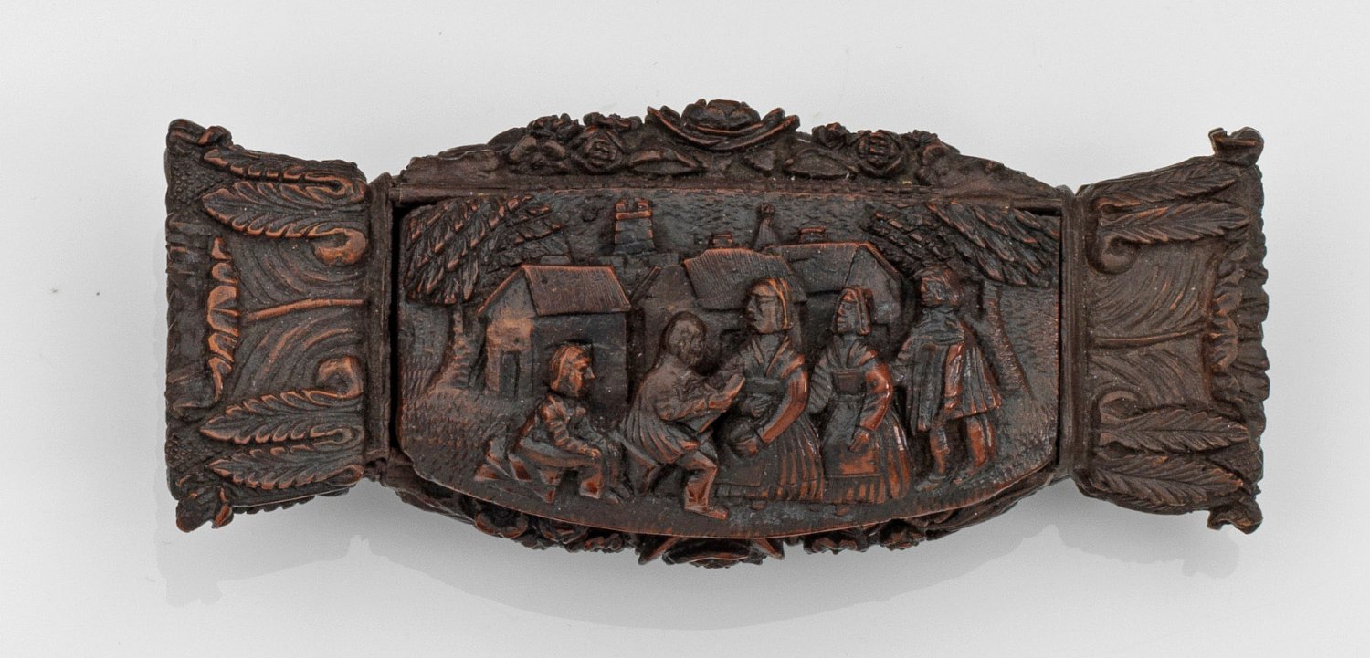Coquilla-Nuss, geschnitzt. Rechteckige Form mit scharniertem Deckel. Flächendeckend reliefplastisch gearbeitete, religiöse Figurenstaffagen vor Dorfansichten. Die Seiten mit Rosenblüten bzw. Akanthusblättern verziert. H. 3,3 cm. 12 cm x 4,5 cm.