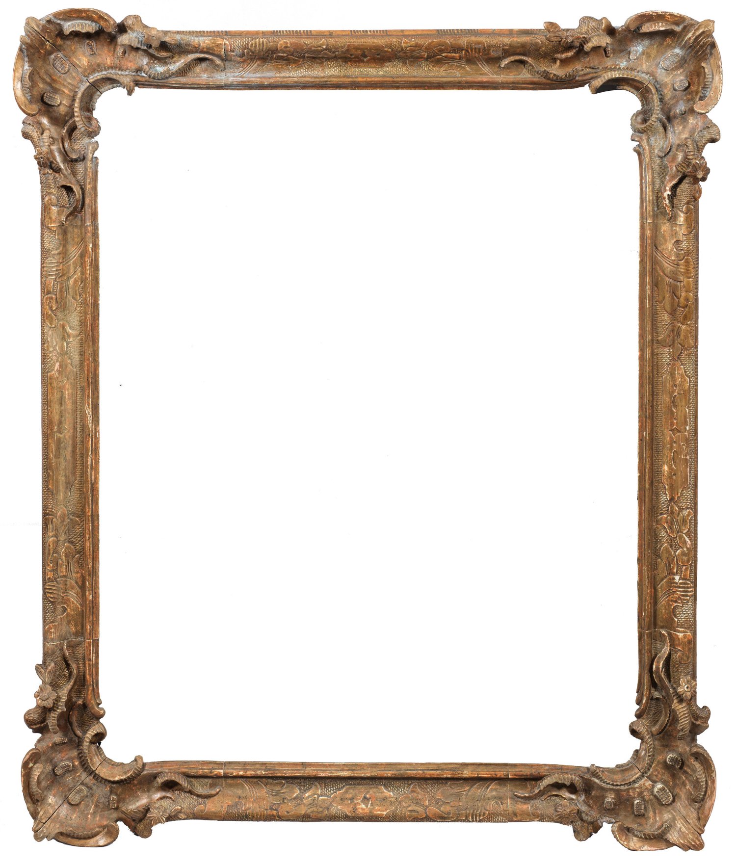 Holz, geschnitzt, gefasst und vergoldet. Rechteckige, profilierte Spiegelrahmung aus reliefiertem Blattwerk. In den Ecken reliefplastisch gestaltetes Muschelwerk und Blüten. Rücks. Reste alter Transportetiketten. 100 cm x 84,5 cm. Falzmaß: 83 cm x 67 cm.