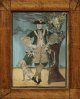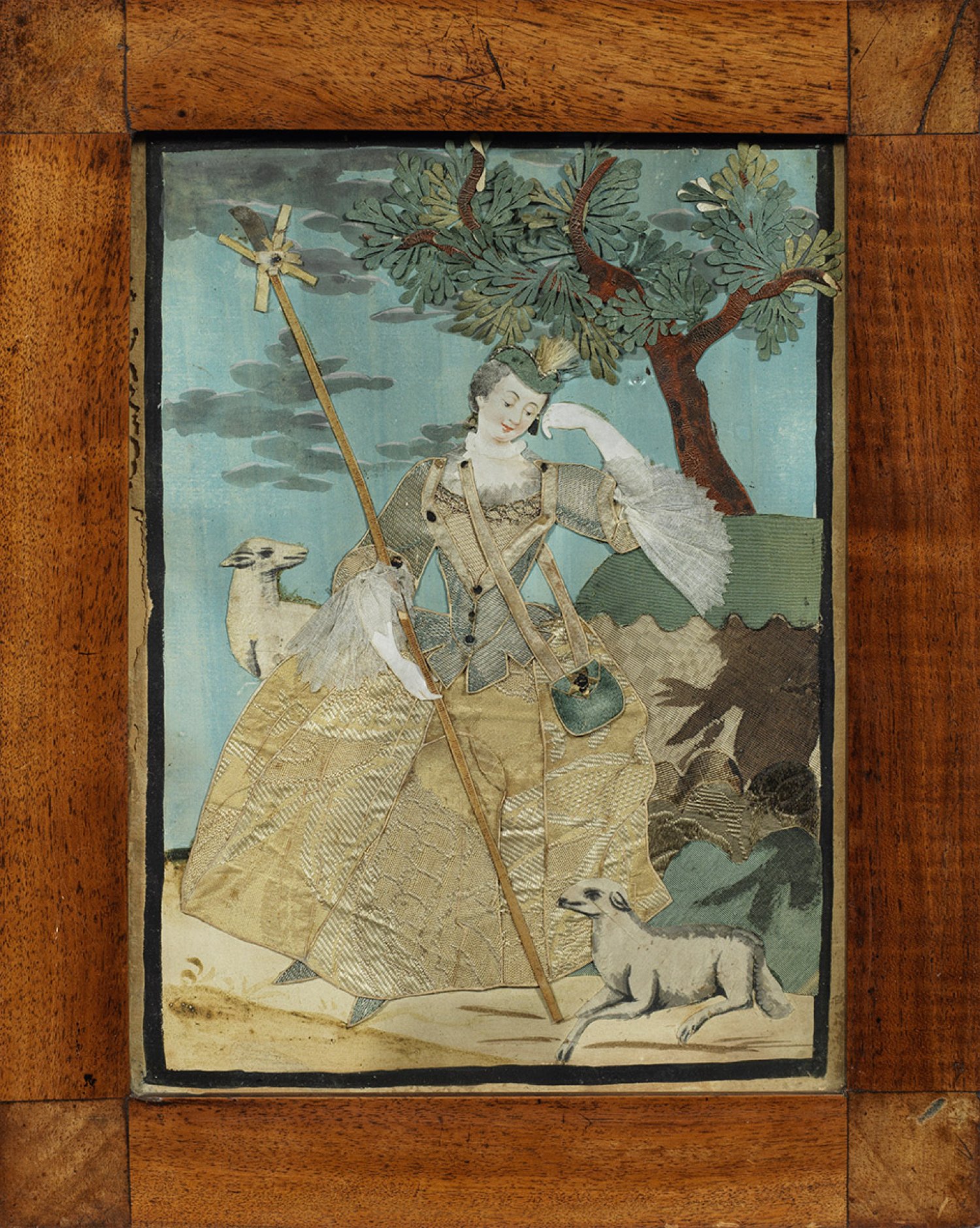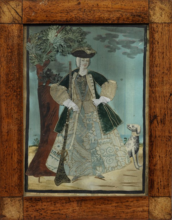 Stoff und Papier. Darstellung eines Jägers und einer Jägerin, je mit Hund sowie einer Schäferin mit zwei Schafen und Hirtenstab vor baumbestandener, weiter Landschaft. Die üppigen Rokoko-Gewänder und Hüte, die Hunde sowie die Blätter der Bäume gestaltet aus passend zugeschnittenen Stücken aus dunkelgrünem Samt, Seide und Brokatstoffen in Pastelltönen. Der Hintergrund gemalt in feiner Temperamalerei. Mit Holzrahmen. Bildmaße: 28,5 cm x 21 cm.