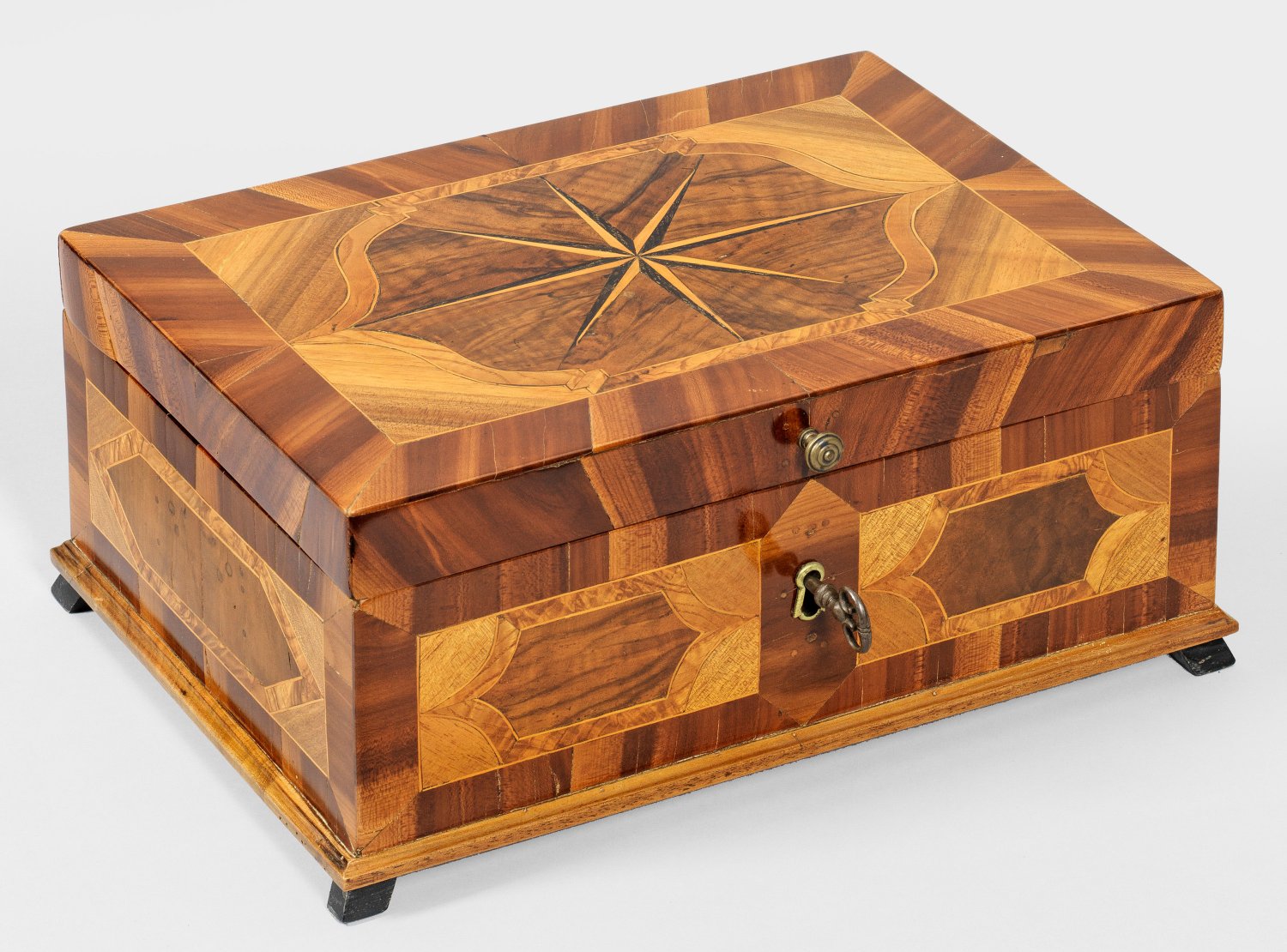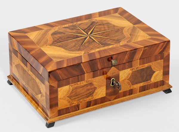 Pflaumenholz und Nussbaum, furniert. Gerader, querrechteckig angelegter Korpus auf schmaler Zarge und gekanteten Füßen. Korrespondierender Flachdeckel mit großem Faltstern. Flächendeckend breit gerahmte Furnierfelder, von Band- und Fadeneinlagen begrenzt. Rest mit Erg.; H. 17,5 cm. 41 cm x 29 cm.