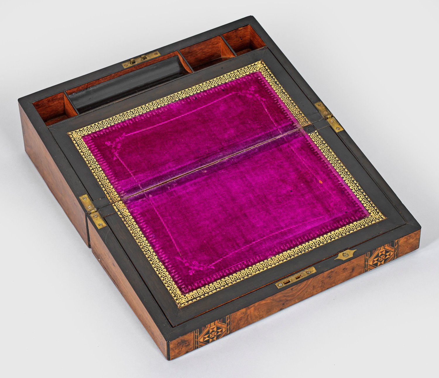 Nussbaum, furniert sowie Einlagen aus unterschiedlichen Edelhölzern. Gerader, querrechteckiger, aufklappbarer Korpus. Innen schräggestellte, aufklappbare, purpurfarbene Arbeitsfläche. H. 15 cm. 39,5 cm x 23 cm bzw. 10 cm. 39,5 cm x 46,5 cm.
