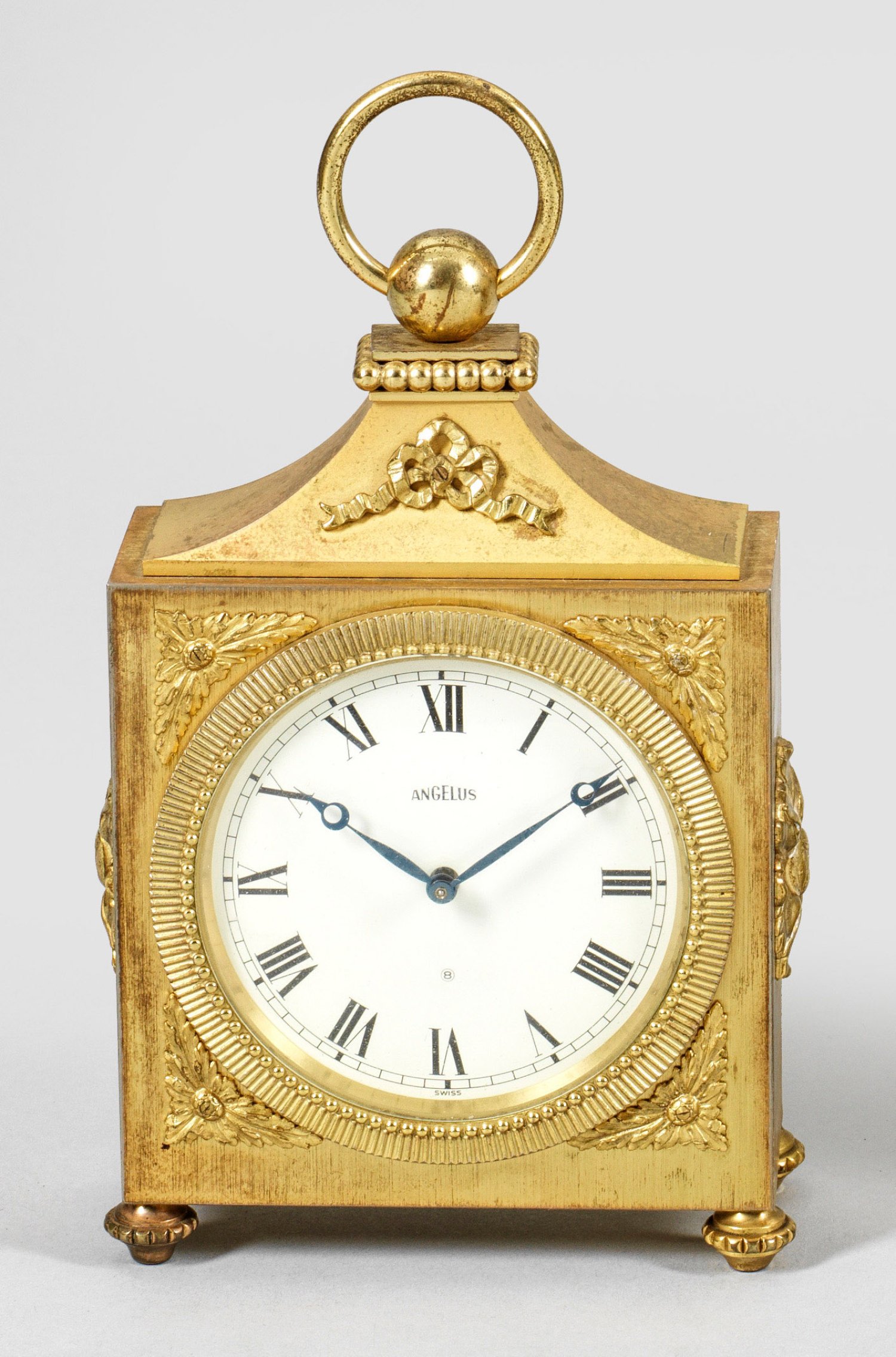 Messing, vergoldet. Rechteckiges Uhrengehäuse mit geschweift ansteigendem oberen Abschluss und Ringgriff. Verglastes Zifferblatt bez. "Angelus". Mechanisches Werk mit Handaufzug und Schlagwerk. H. 19 cm.