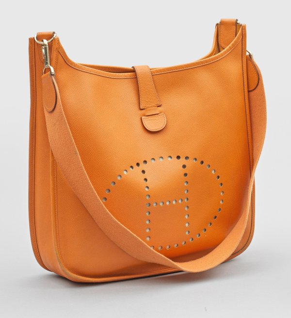 Orangefarbenes Epson Leder und vergoldete Hardware. Gerundeter Korpus mit großem Innen- und flachem Seitenfach sowie schauseitig gestanztem H-Logo. Breiter Schulterriemen aus Canvas. Date-Stamp RB sowie I im Quadrat. Herstellerzeichen. Gebrauchsspuren. Taschen-H. 35 cm. 33 cm x 9 cm. Staubbeutel.