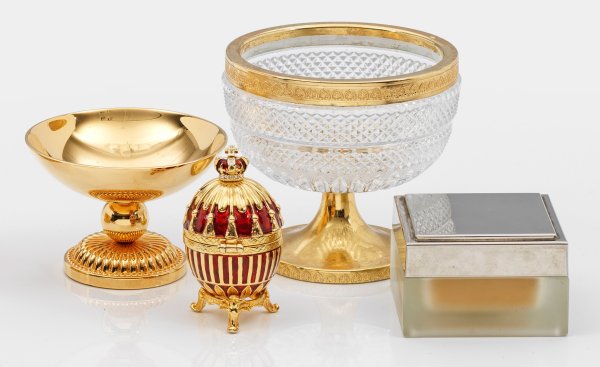 4-tlg.; Duftkerze von Tiffany & Co., teilw. vergoldete Aufsatzschalen, dekorative Dose in Form eines rot emaillierten und vergoldeten Prunkeis. Minim. Gebrauchsspuren. Teilw. Herstellerzeichen. H. 5 cm-11,5 cm.