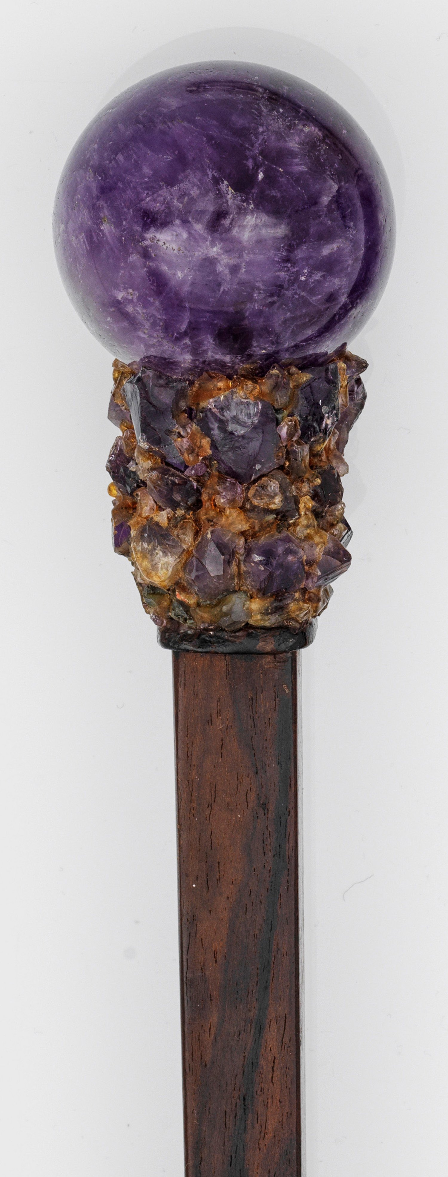 Amethyst, Holz. Vierfach gekanteter, konischer Holzschaft, übergehend in kristallin gestalteten Ansatz mit geschliffener, lila- und weißfarben melierter Amethyst-Kugel als Knauf. L. 86 cm.