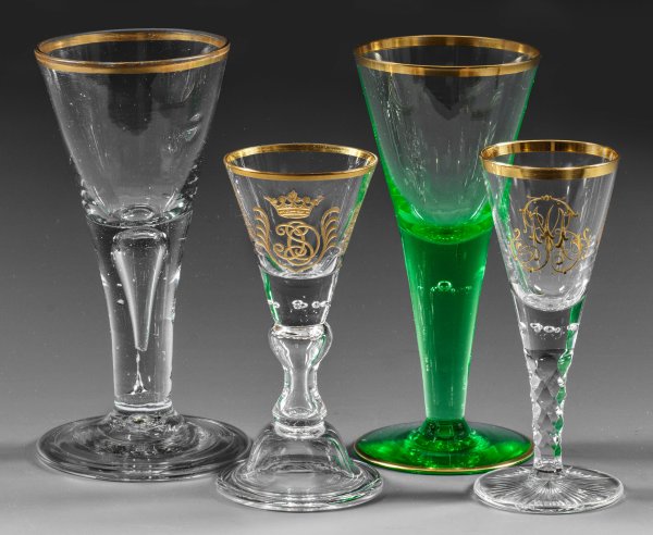 Farbloses und hellgrünes Glas, vergoldeter Lippenrand. Spitzkelchform, ein Glas mit Glockenfuß und Balusterschaft. Ein Barock-Pokal mit Abriss und umgeschlagenem Fußrand. Zwei Gläser mit geschnittenem und vergoldetem Monogramm. H. 13 cm-16 cm.