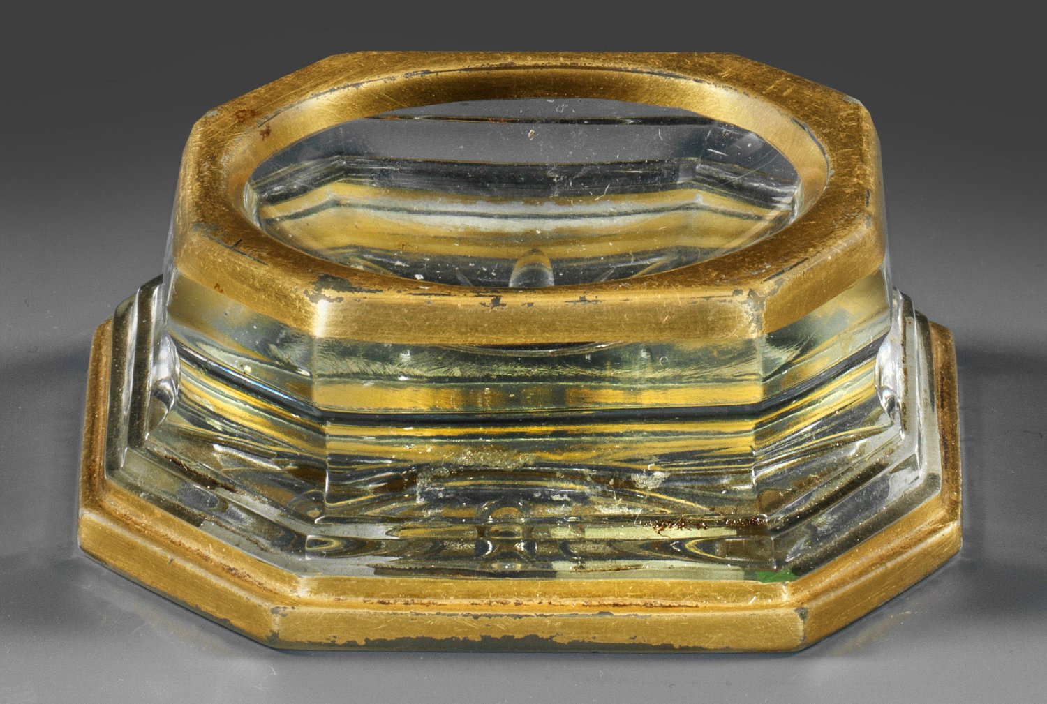 Farbloses Glas, geschliffen. Länglich-achteckiger, abgetreppter Korpus mit ovaler Mulde. Geschliffene Bodenrosette. Vergoldete Ränder. H. 3,1 cm; L. 8,2 cm.