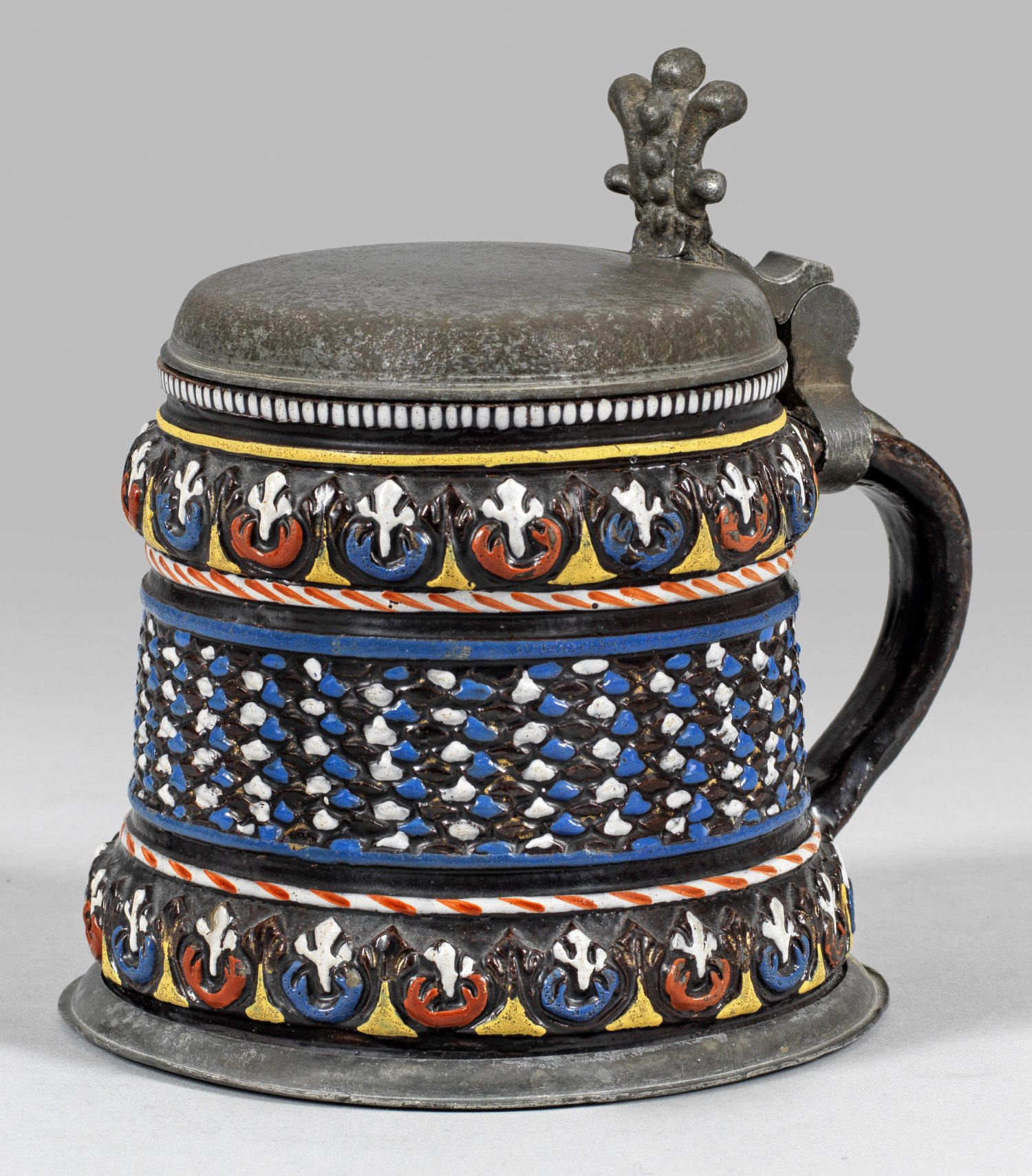 Sog. Annaberger Steinzeug. Dunkelbraun engobiertes, salzglasiertes Steinzeug mit polychromer Emailbemalung. Auf der Wandung flächendeckender ornamentaler Reliefdekor. Zinnmontierung, Deckel mit Palmettendrücker, gem. Marienberg, Meister Hans Klemm (tätig um 1669-1705; Vgl. Hintze, Bd. I, Nr. 915). H. 15 cm.