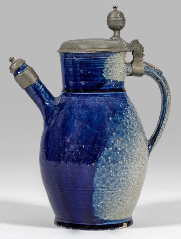 Graues salzglasiertes Steinzeug mit kobaltblauem Smaltebewurf. Ovoider Korpus, Zylinderhals, Ohrenhenkel. Die Wandung partiell durch feine Drehrillen unterhalb des Henkelansatzes, an Schulter, Hals und Tülle akzentuiert, der Henkel horizontal gerieft. Standkante ger. best.; Zinndeckel mit Kugeldrücker und graviertem Monogramm, dat. 1762, die gerade Röhrentülle mit Zinnscharnierdeckel. H. 27,5 cm.