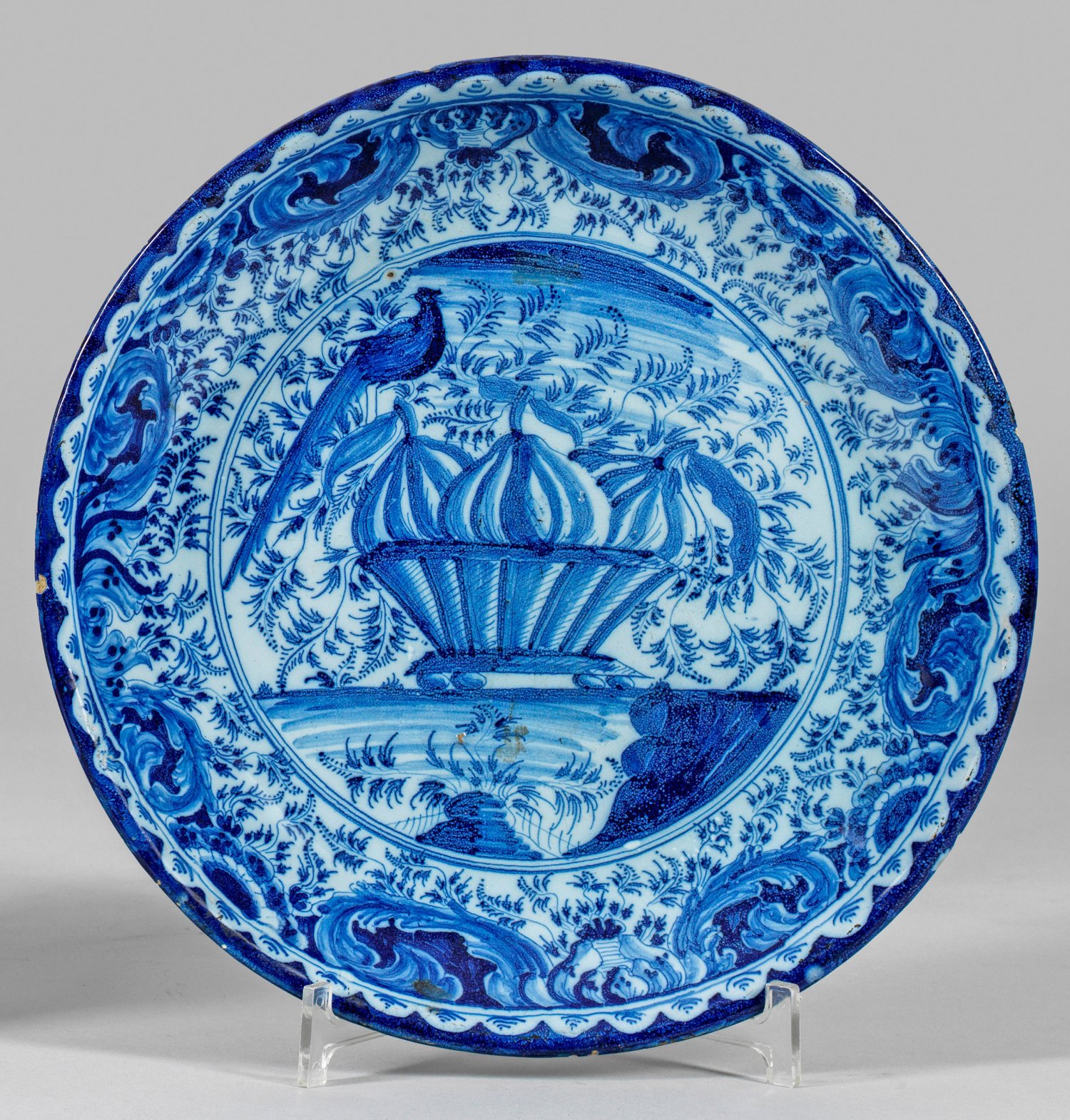 Runde, flach gemuldete Form. Kleisterblaue Glasur. Flächendeckender Dekor in kobaltblauer Scharffeuermalerei aus einem großen Bildfeld mit Früchtekorb und Vogel in Landschaft, die Kehlung und der Rand mit Sonnenblumenmotiven, Akanthusblättern, feinen, farnartigen Ranken und Ornamenten. Besch.; D. 31 cm.