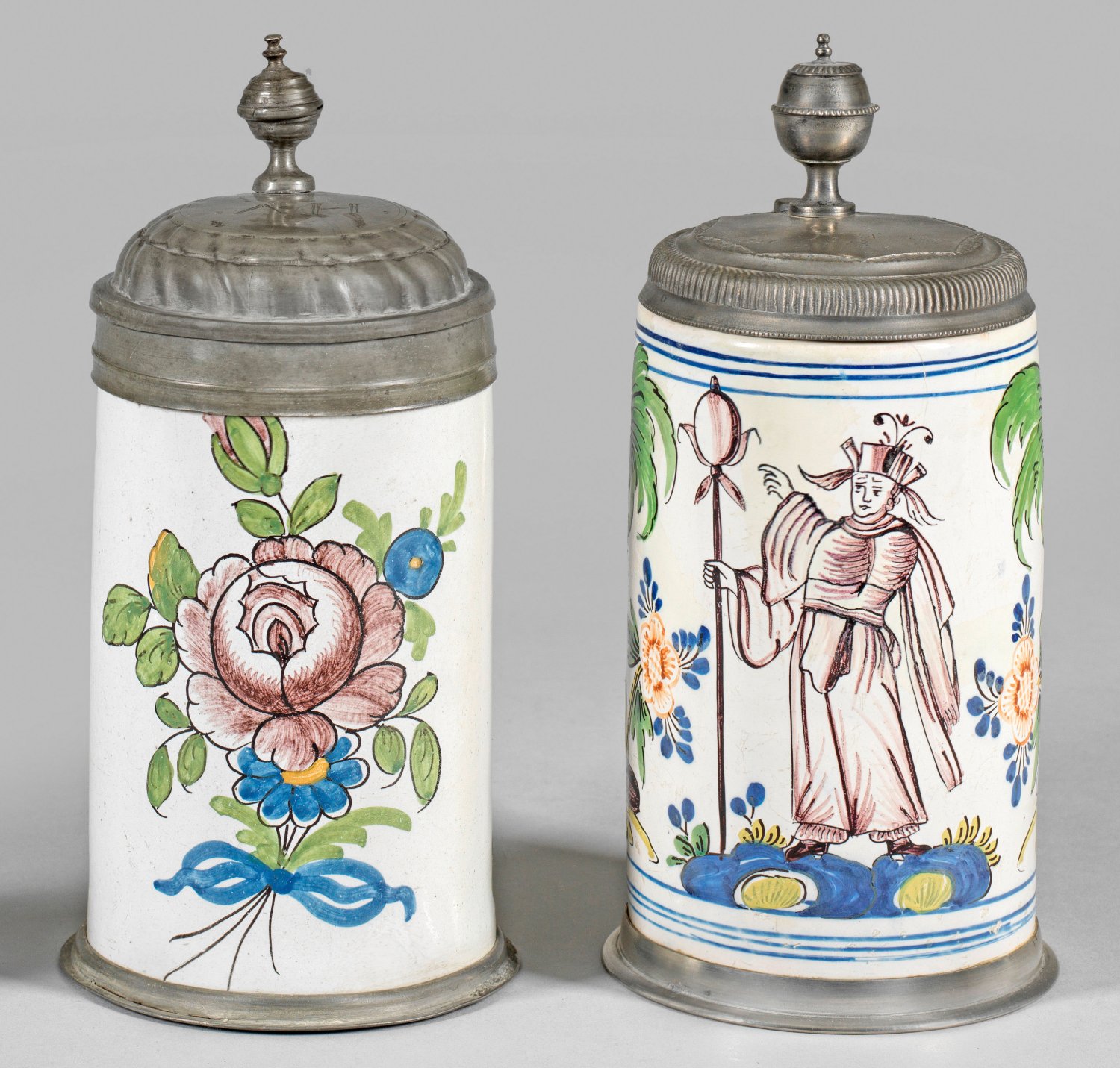 Fayence. Polychromer Scharffeuerdekor aus einem Chinesen in stilisierter Landschaft bzw. einem Blumenbukett. Ger. besch./rest.; ein Krug am Lippenrand best. bzw. mit ger. Haarrissen. Zinnmontierung, die Deckel mit graviertem Monogr., einer dat. 1773. H. 23,5 cm.