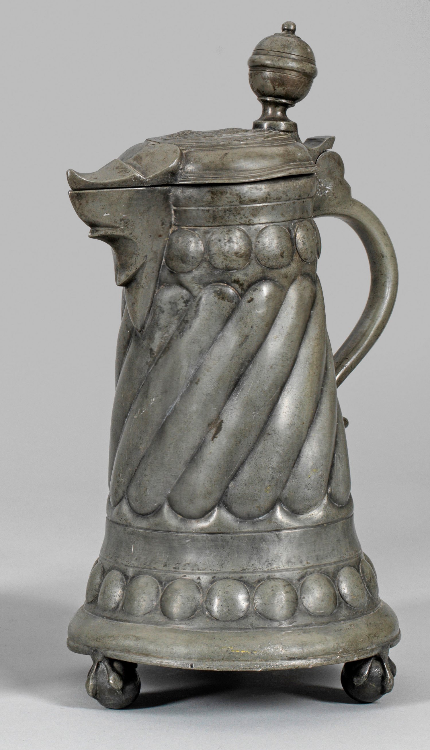 Zinn. Über drei, eine Kugel greifenden Klauenfüßen, trompetenförmiger Korpus, umlaufend gegliedert durch zungenförmige Godronen und fischblasenähnlichem Dekor. Scharnierter Deckel mit Schnabelausguss und großem Kugelknauf. Zentral das Profilporträt Friedrichs II. von Preußen und umlaufend bez. "Fridericus Borussorum Rex Invictus". Massiver Ohrenhenkel. Minim. altersbedingte Gebrauchsspuren. Auf der Unterseite undeutlich gemarkt. H. 46 cm.