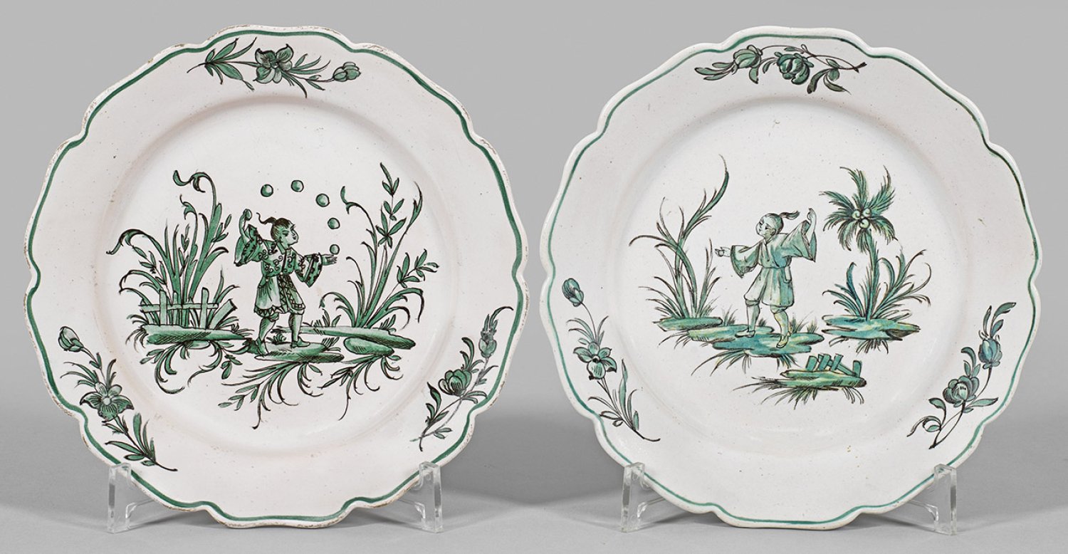 A pair of French Marseille Veuve Perrin manufactury faience plates with green Chinoiserie decor. Marked "VP".