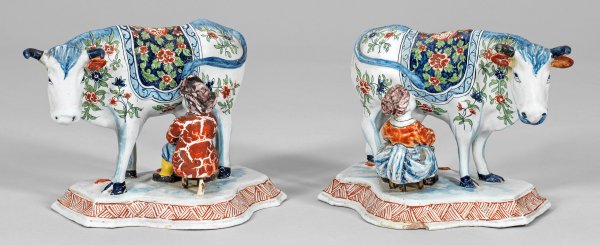 Fayence. Gegenstücke. Vollplastische Figuren. Auf einem passigen Sockel stehende Kühe, an einer Seite auf Melkschemeln sitzend Bauer bzw. Bäuerin mit Eimer. Polychromer Dekor. Ger. best., besch. u. rep.; Gemarkt "APK" in Ligatur.