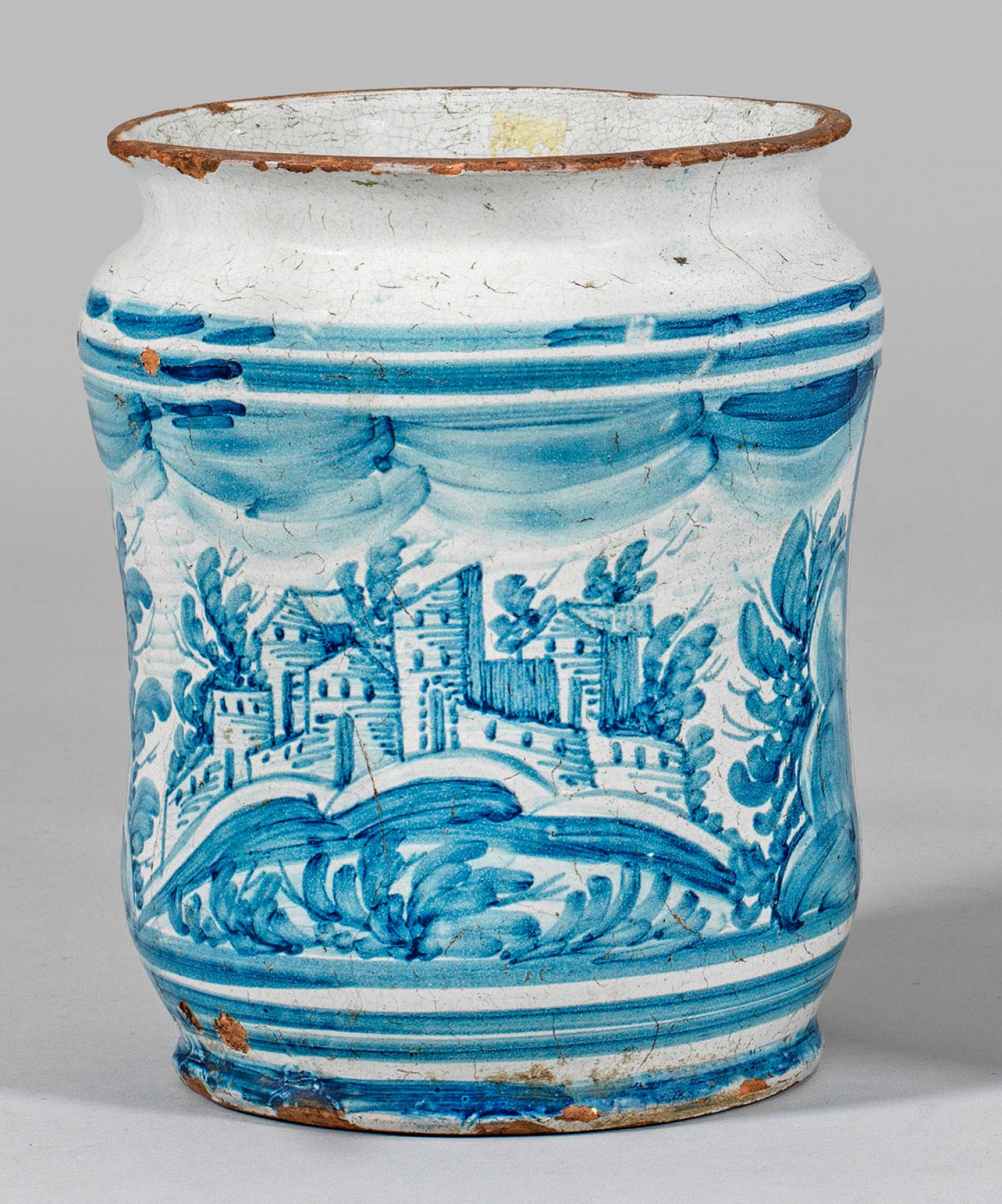 An Italian Naples blue and white maiolica albarello with landscape. Chips, minor hairline cracks.